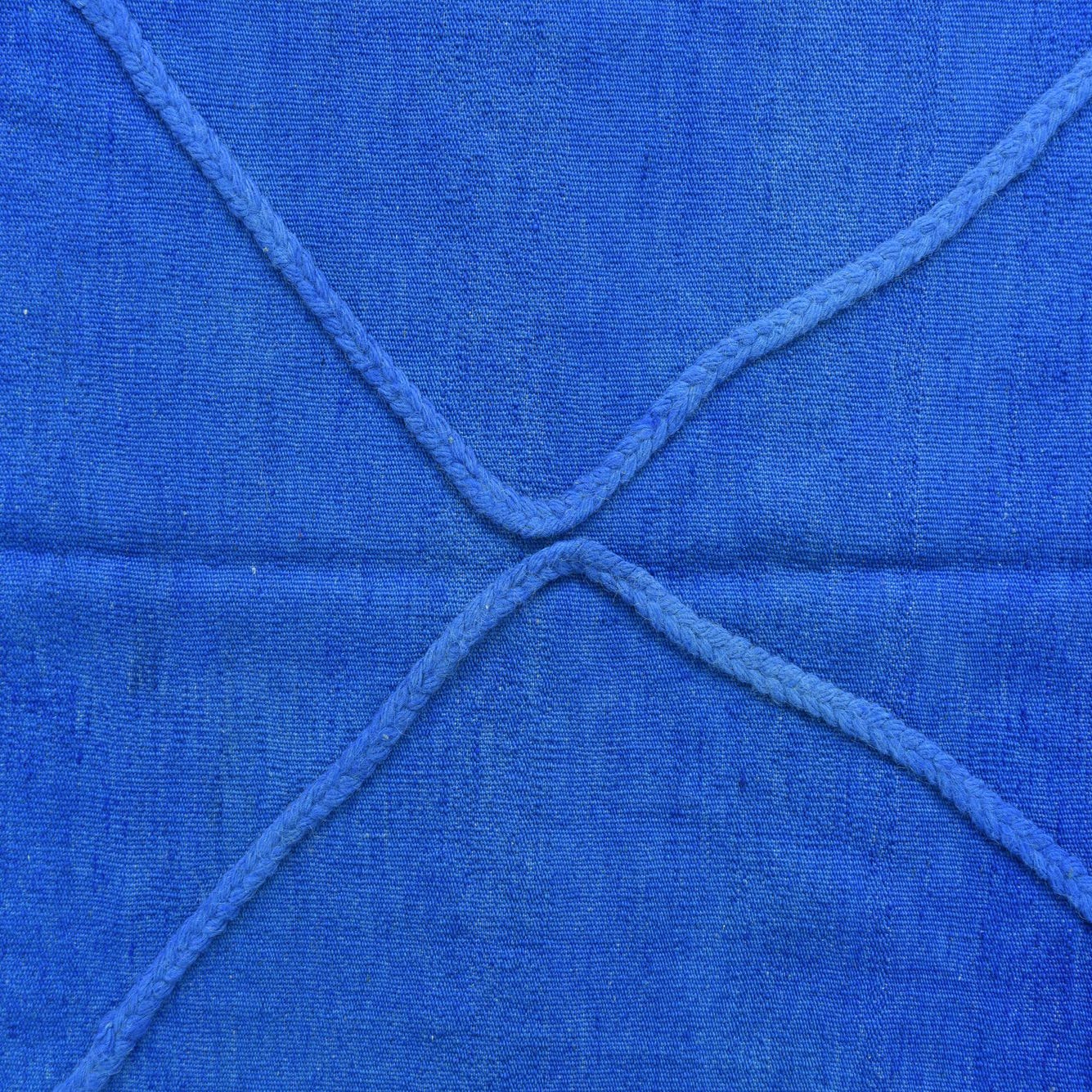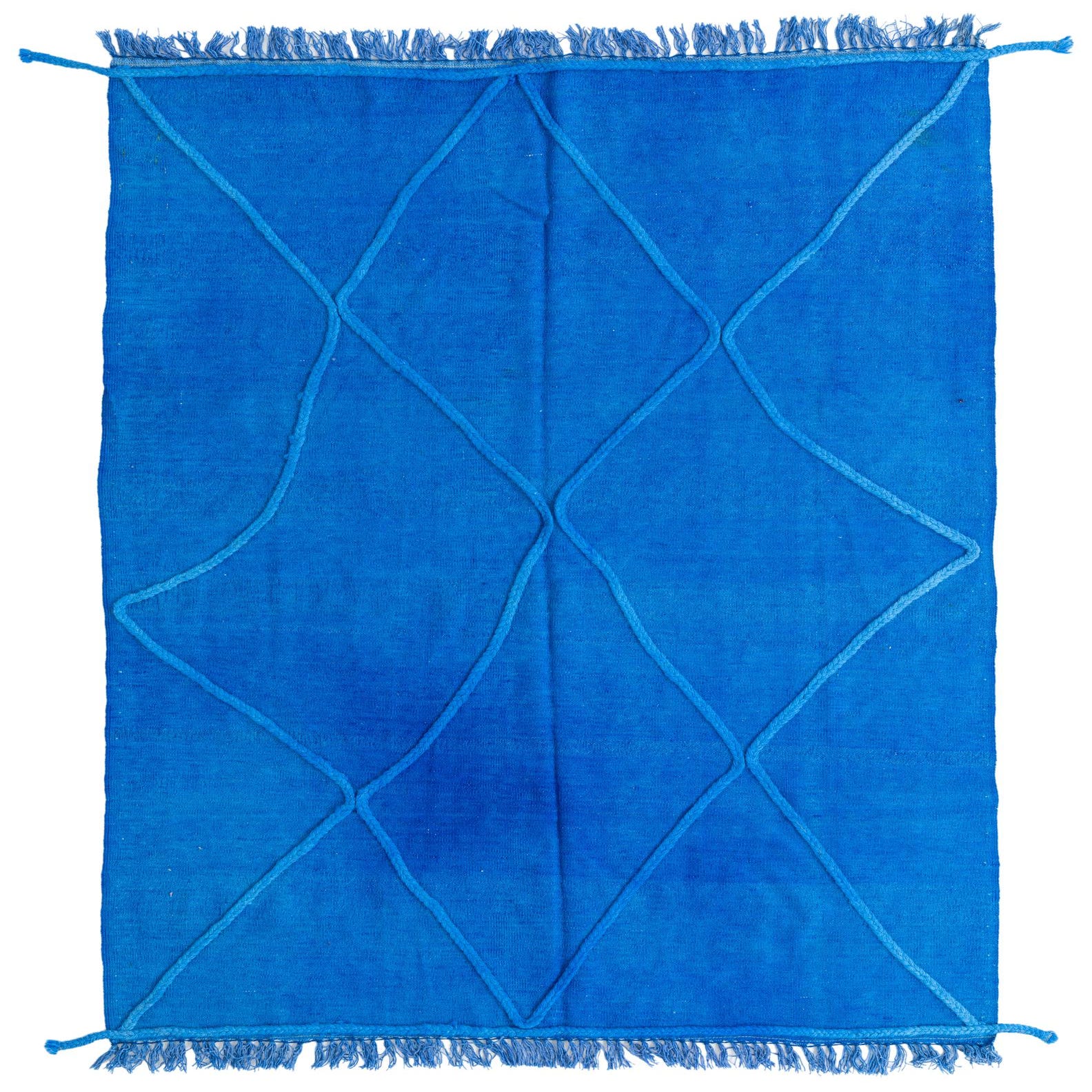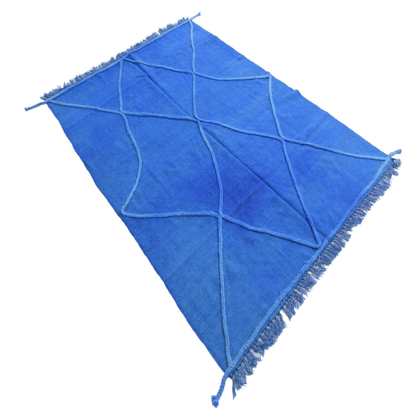 This Moroccan collection rug boasts a rich blue background, presenting a striking yet harmoniously simple design. Hand-knotted of 100% wool, this 4x6 piece features a bold diamond lattice pattern in a subtle tone-on-tone colorway, offering texture and visual depth to the surface. The tactile quality of the wool provides a plush feel underfoot, enhancing the luxurious yet understated aesthetic. Fringed edges add a traditional touch, respecting the cultural heritage of its design roots.