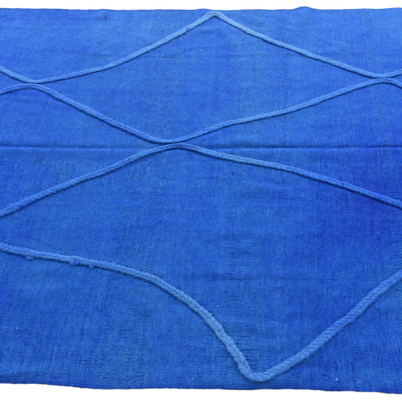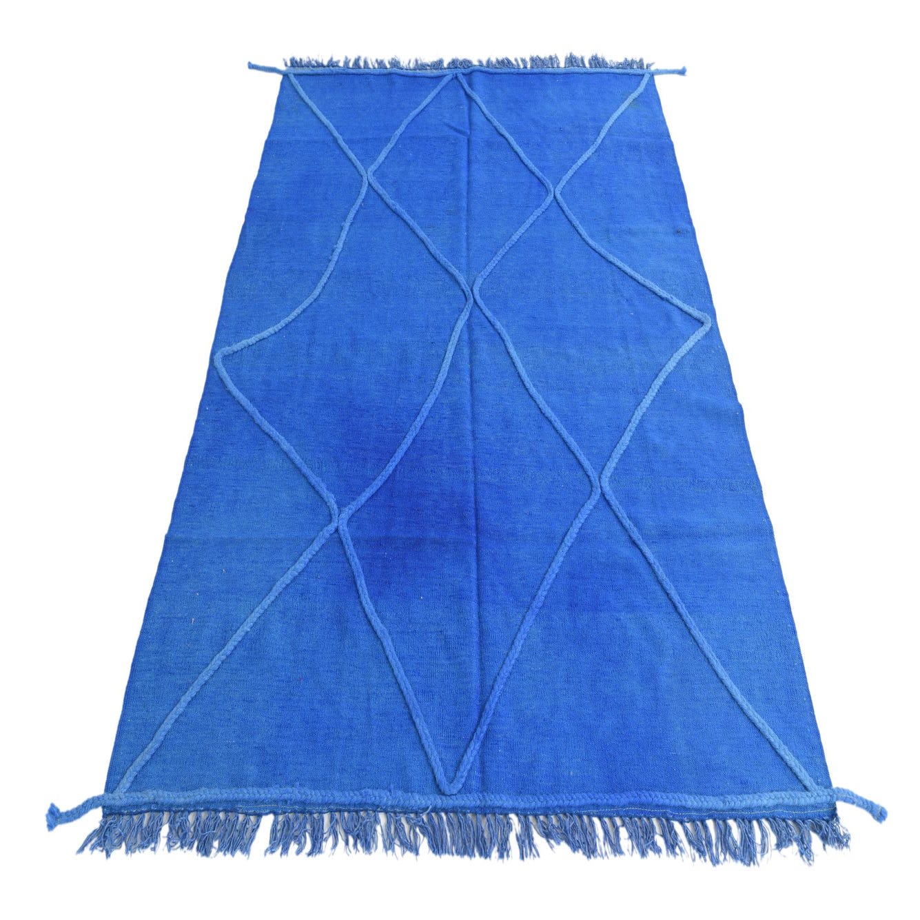 A vibrant 4x6 rectangular blue shag rug with a raised geometric diamond pattern and fringed edges, perfect for a modern living room.