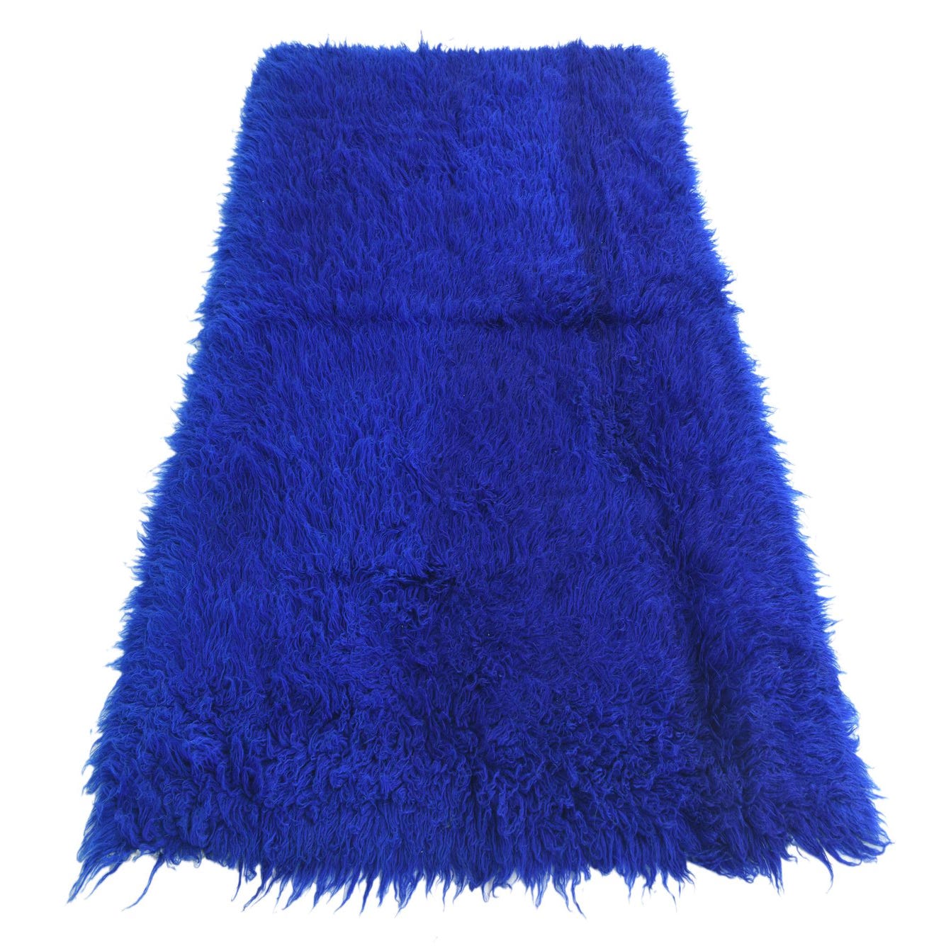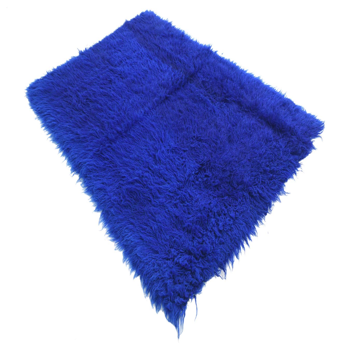 This hand-knotted 4x6 rug from our Moroccan collection is crafted with 100% wool, offering a plush, inviting texture underfoot. The rug boasts a rich, uniform blue color throughout its shaggy surface that exudes a sense of depth and warmth. Its generous wool fibers provide a tactile experience that adds to the cozy aesthetic it brings to any room.