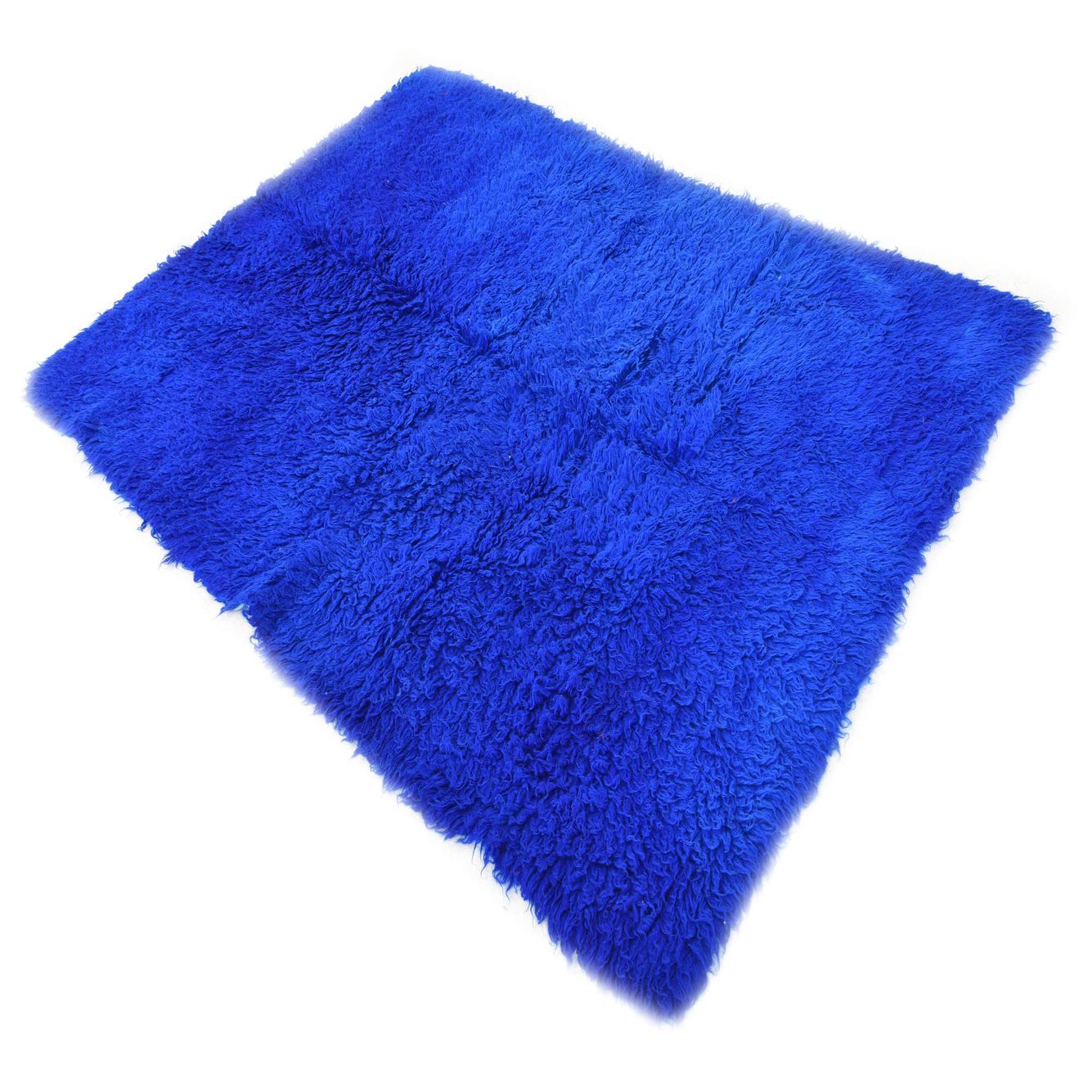Hand-knotted from 100% wool, this piece presents a single-field design in a deep cobalt blue. The long, lofty pile creates a plush, shaggy surface that invites touch; the wool fibers have a soft, slightly matte luster and the pile direction produces gentle tonal shifts that give the surface depth without a defined motif. The overall look is minimal and textural—color-forward rather than patterned.