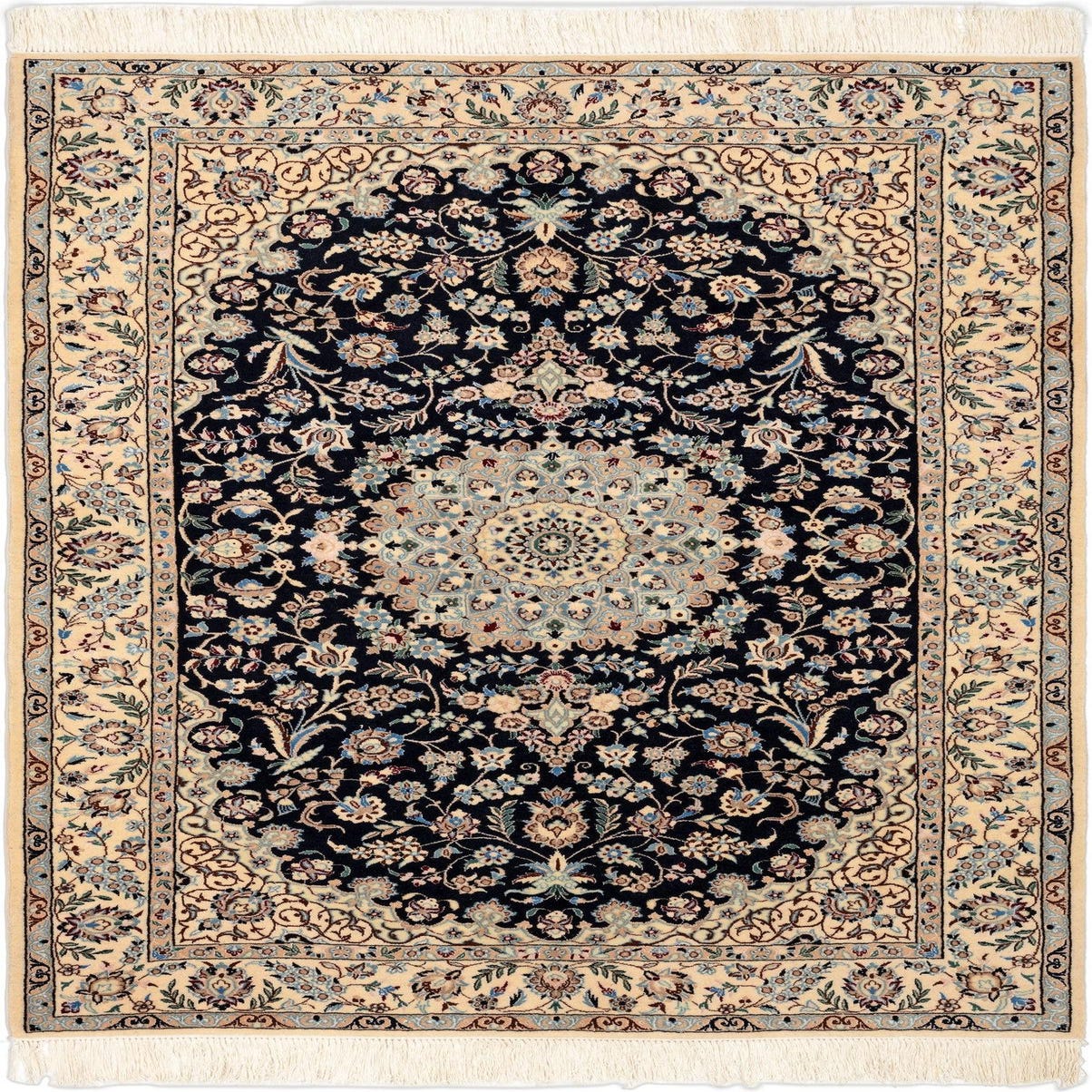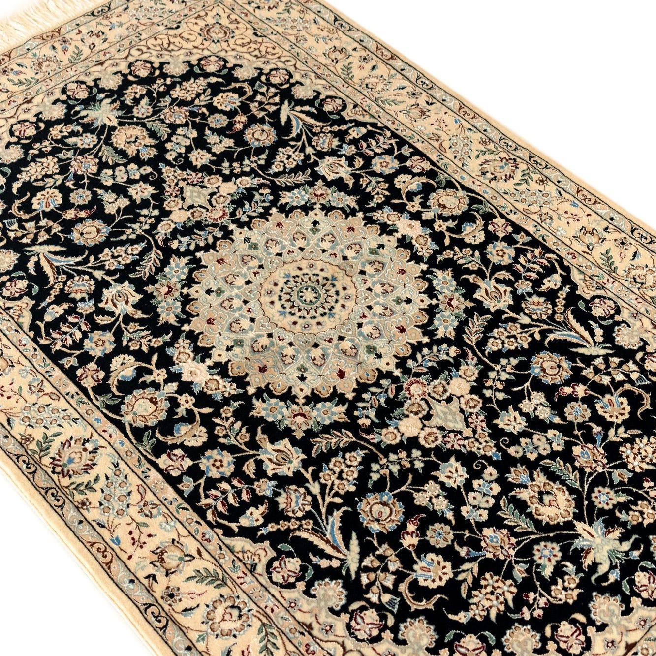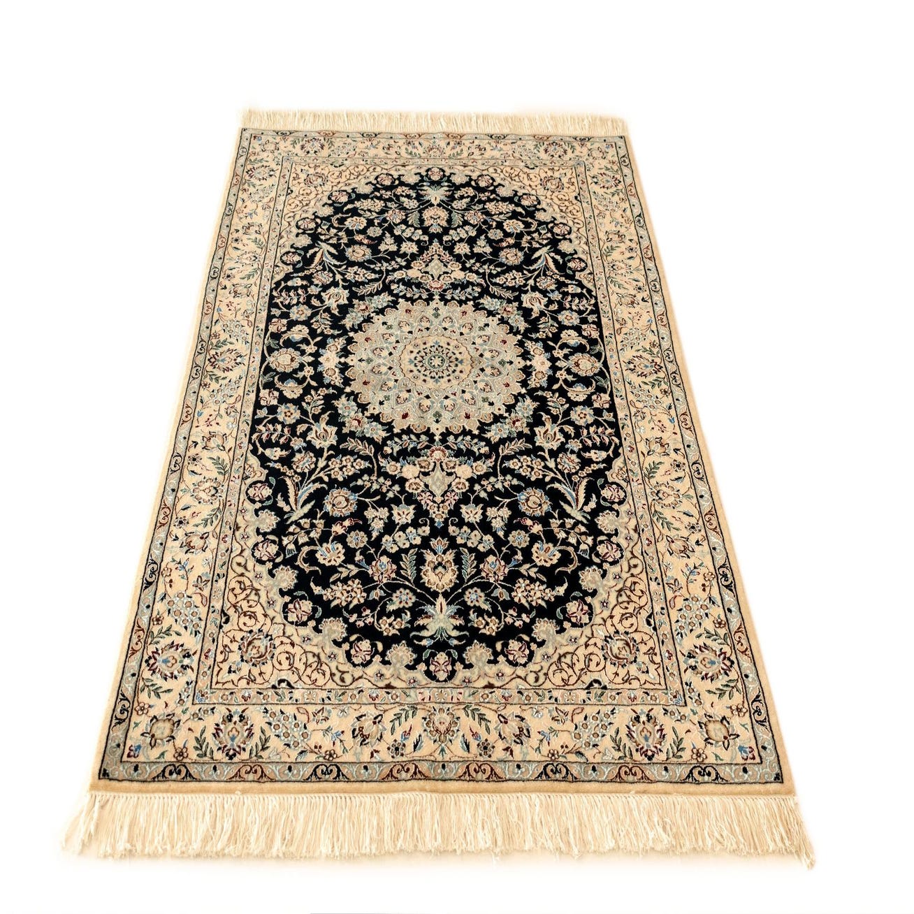 The Nain collection rug is a hand-made piece, showcasing a sophisticated pattern imbued with tradition and craftsmanship. Primarily featuring a deep blue background, this 4x6 rug presents an intricate array of floral motifs that unfold in a symmetrical fashion, with the central medallion drawing the eye inward. Delicate touches of beige are thoughtfully dispersed throughout the design providing a lifelike quality to the botanical elements.