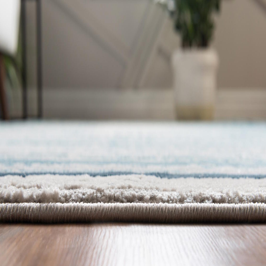 Machine made from 65% polypropylene and 35% polyester, the rug has a low-profile pile with a soft, even hand and a slight sheen from the polyester fibers. It works well in modern, coastal, or transitional interiors — place it under a compact living-room arrangement, in a bedroom to anchor a nightstand grouping, or in an entry to set a welcoming tone. Pair it with light wood furniture, gray or ivory upholstery, and navy accents for a cohesive, relaxed palette.