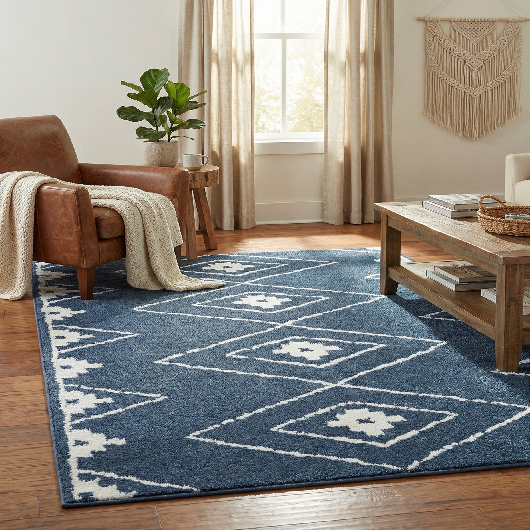 A 4x6 rectangular Oslo rug in deep blue with a modern white geometric diamond pattern, ideal for various indoor rooms.