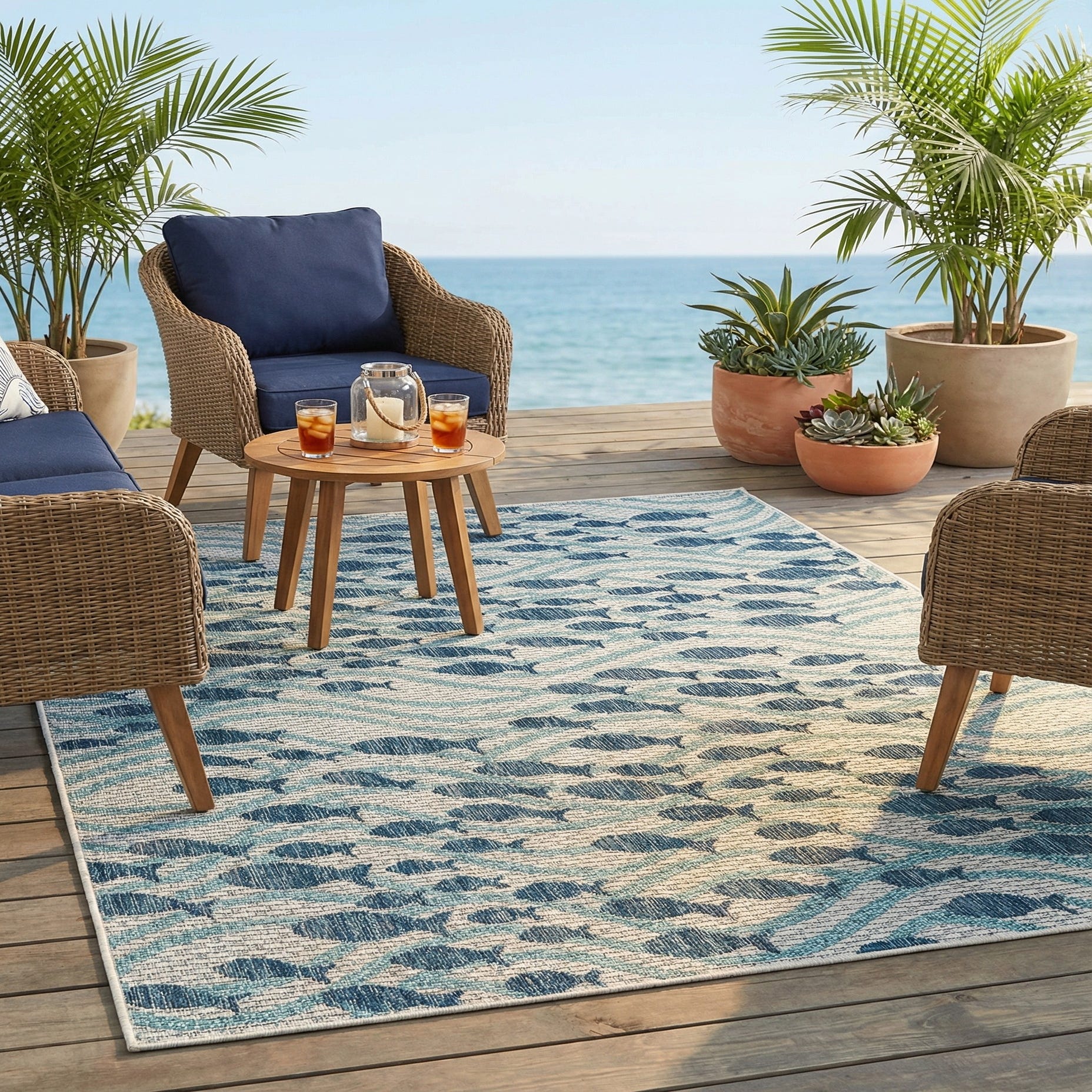 This rug works well on a covered patio or poolside seating area, in a sunroom or beach house living room, and as an accent under a casual dining table or in a coastal-themed entryway. Pair it with light wood or rattan furniture, navy throw pillows and ivory linens to reinforce the seaside palette, or use it to add color and pattern to neutral furnishings for an easy, relaxed look.