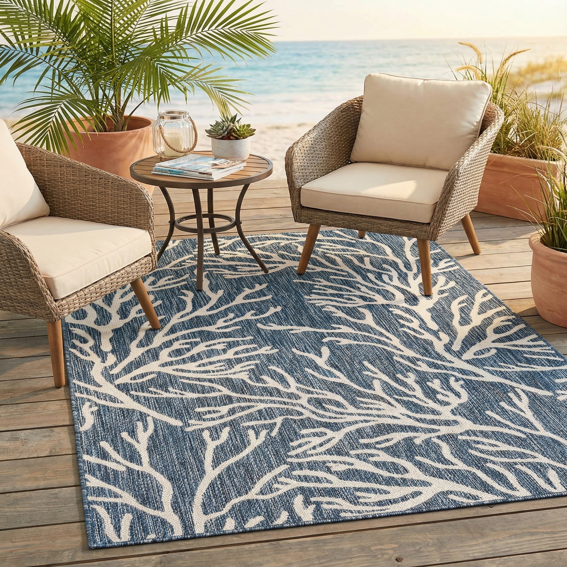 A 4x6 rectangular blue and white coastal rug with a modern coral branch pattern, suitable for indoor or outdoor use.