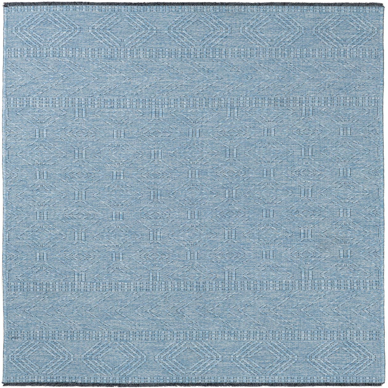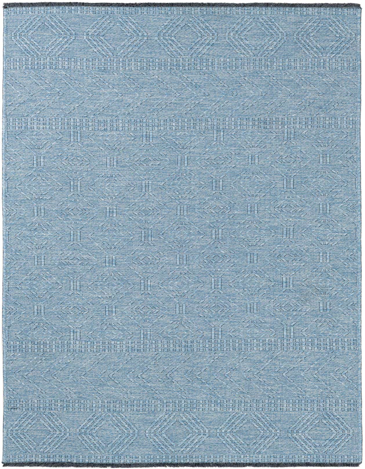 Primary color is Blue. Colors in this rug include: Blue, Ivory.