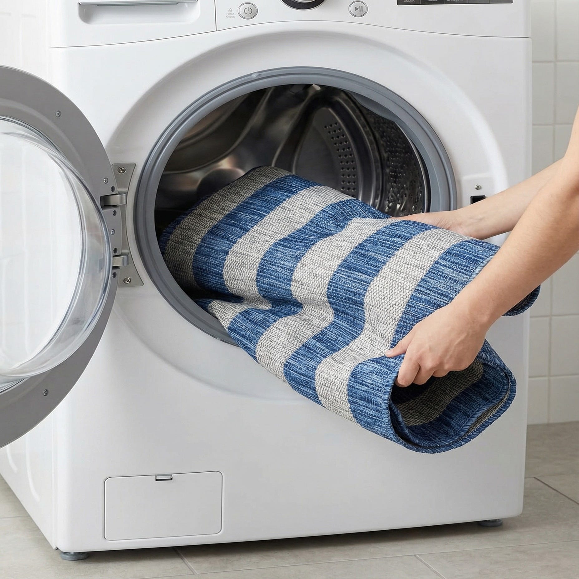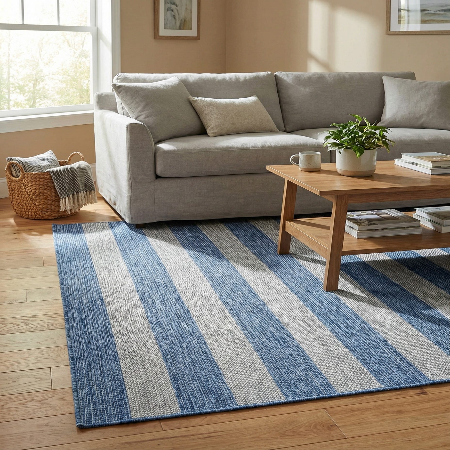 This piece is well-suited to outdoor living areas and high-traffic interior spots alike; place it on a covered patio, sunroom, or entryway for an easy, coastal touch. It pairs nicely with woven wicker or painted wood furniture, navy and white textiles, and natural-finish tables for a laid-back, contemporary look. For a modern nautical scheme, layer it with neutral cushions and weathered-metal accents to reinforce the rug’s crisp, striped character.
