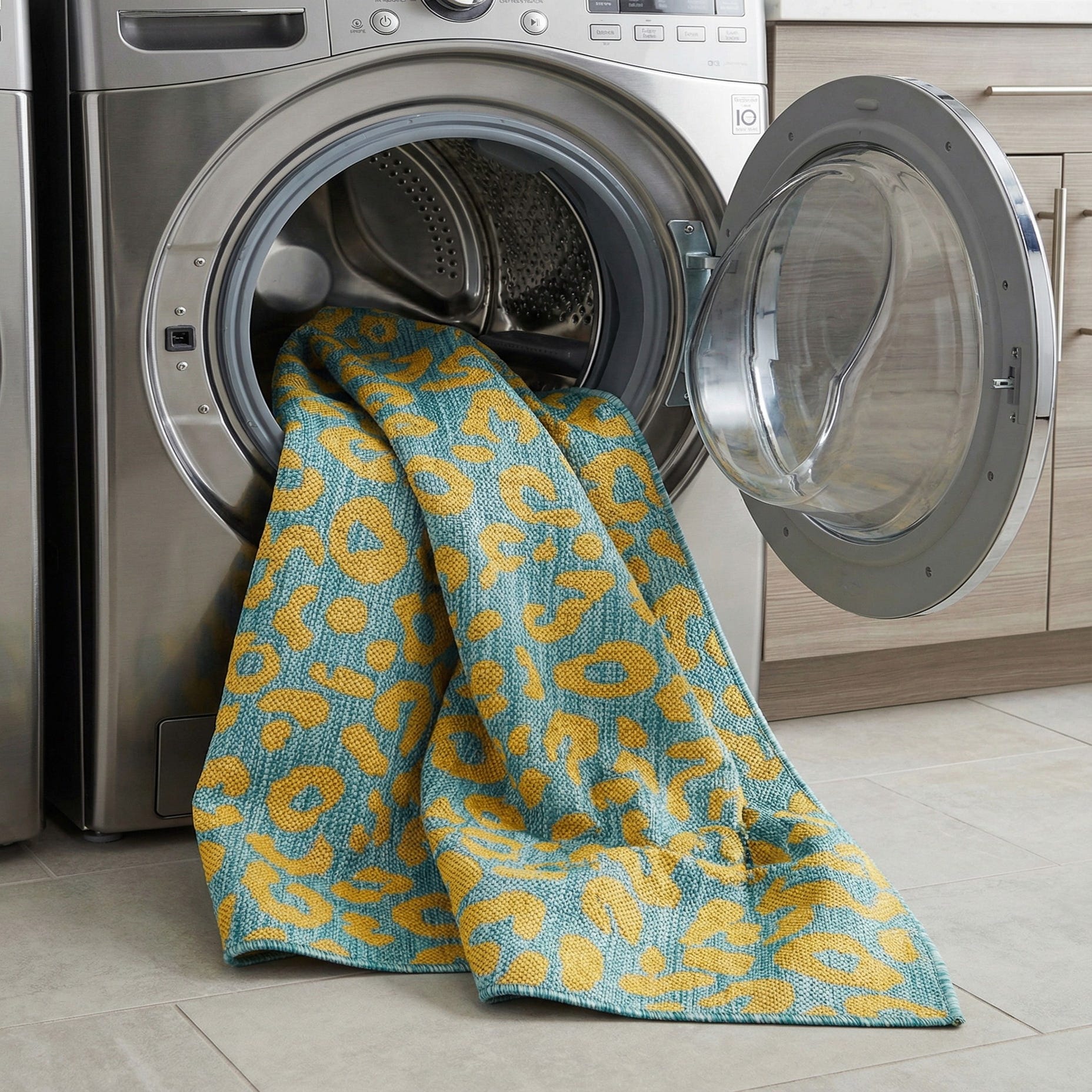 A 4x6 rectangular indoor/outdoor rug with a modern blue and yellow leopard print pattern, suitable for a patio or living room.