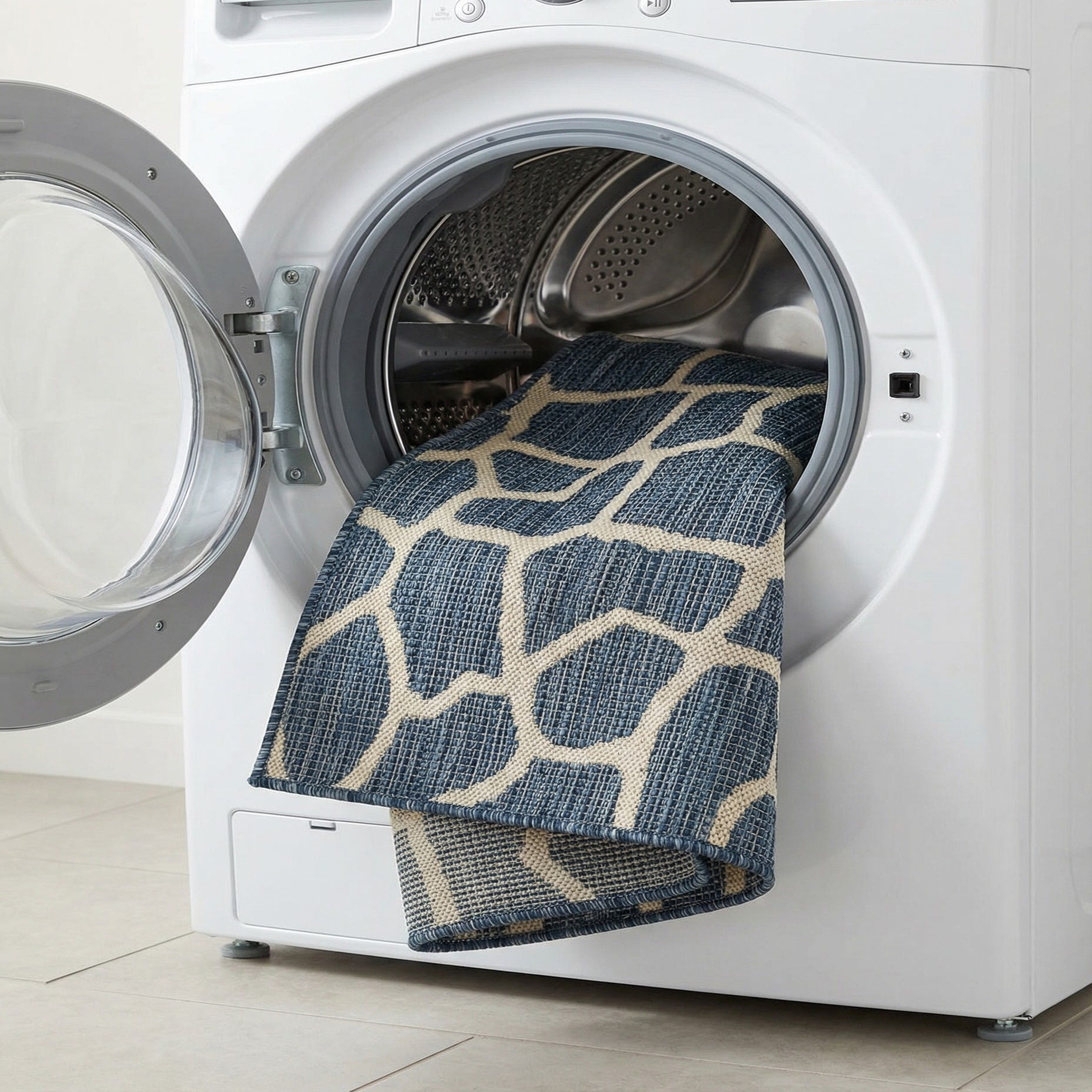 A 4x6 rectangular blue and beige indoor/outdoor rug with an abstract, eclectic giraffe print pattern.