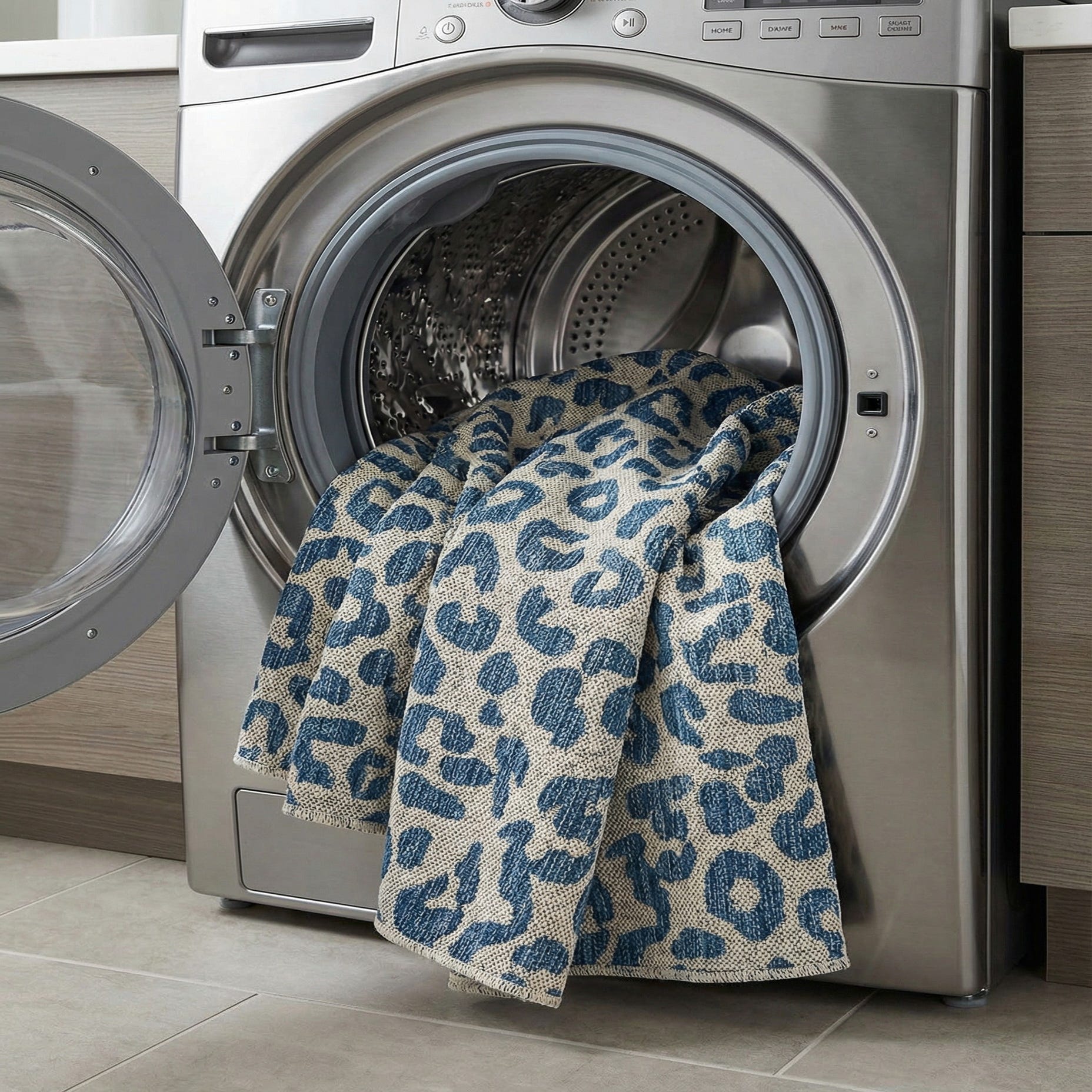 A 4x6 rectangular indoor/outdoor rug with a modern blue leopard print pattern on a light background, featuring a flatweave texture.