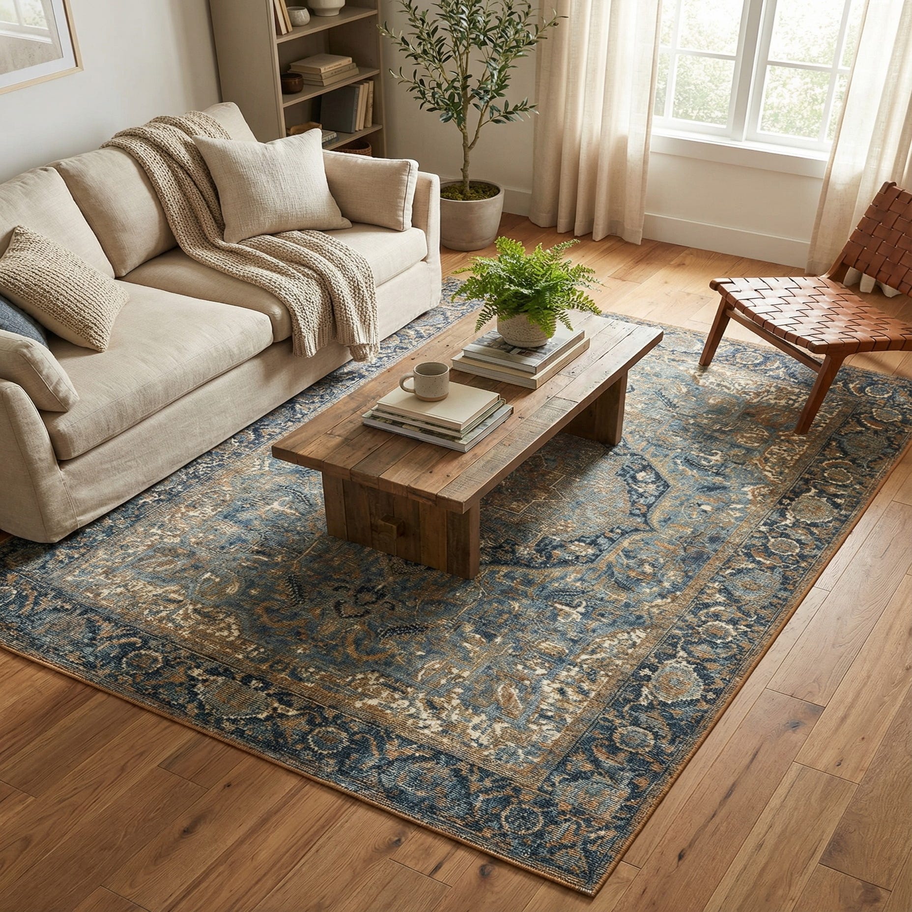A 4x6 rectangular blue and gold traditional medallion rug with a distressed vintage look, suitable for indoor or outdoor use.