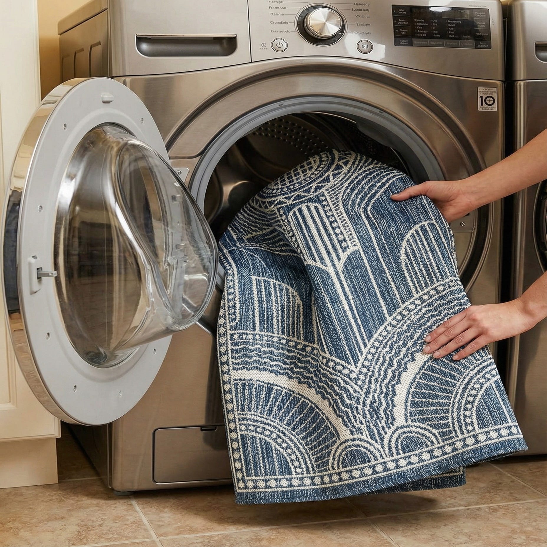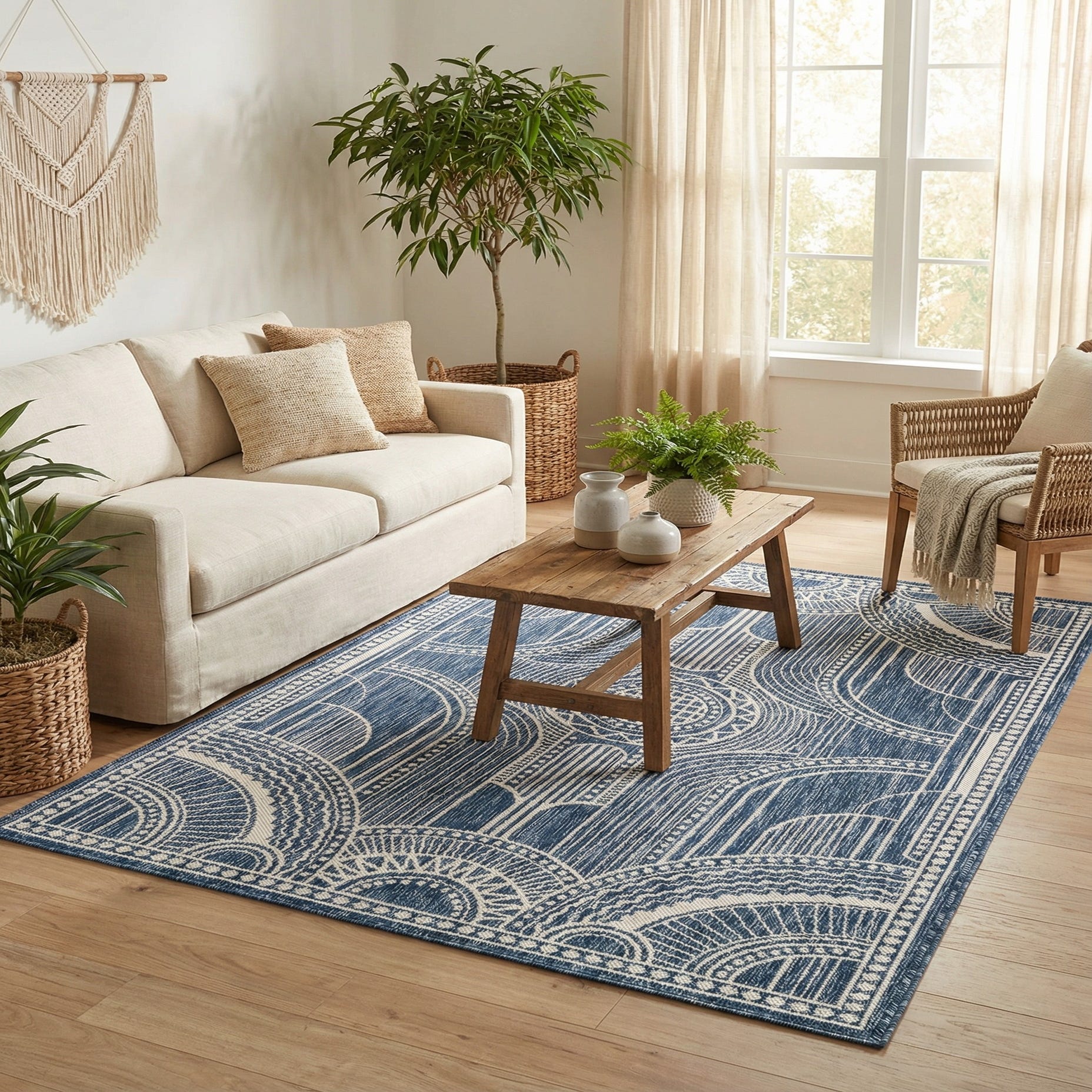Place it on a covered patio or balcony to anchor a bistro set, or use it inside to define a casual dining area or entry where its flat, supportive texture will handle frequent foot traffic. It pairs naturally with weathered teak, white or wicker seating and navy or neutral cushions for a coastal look, or with streamlined metal and glass furnishings for a modern-traditional mix.