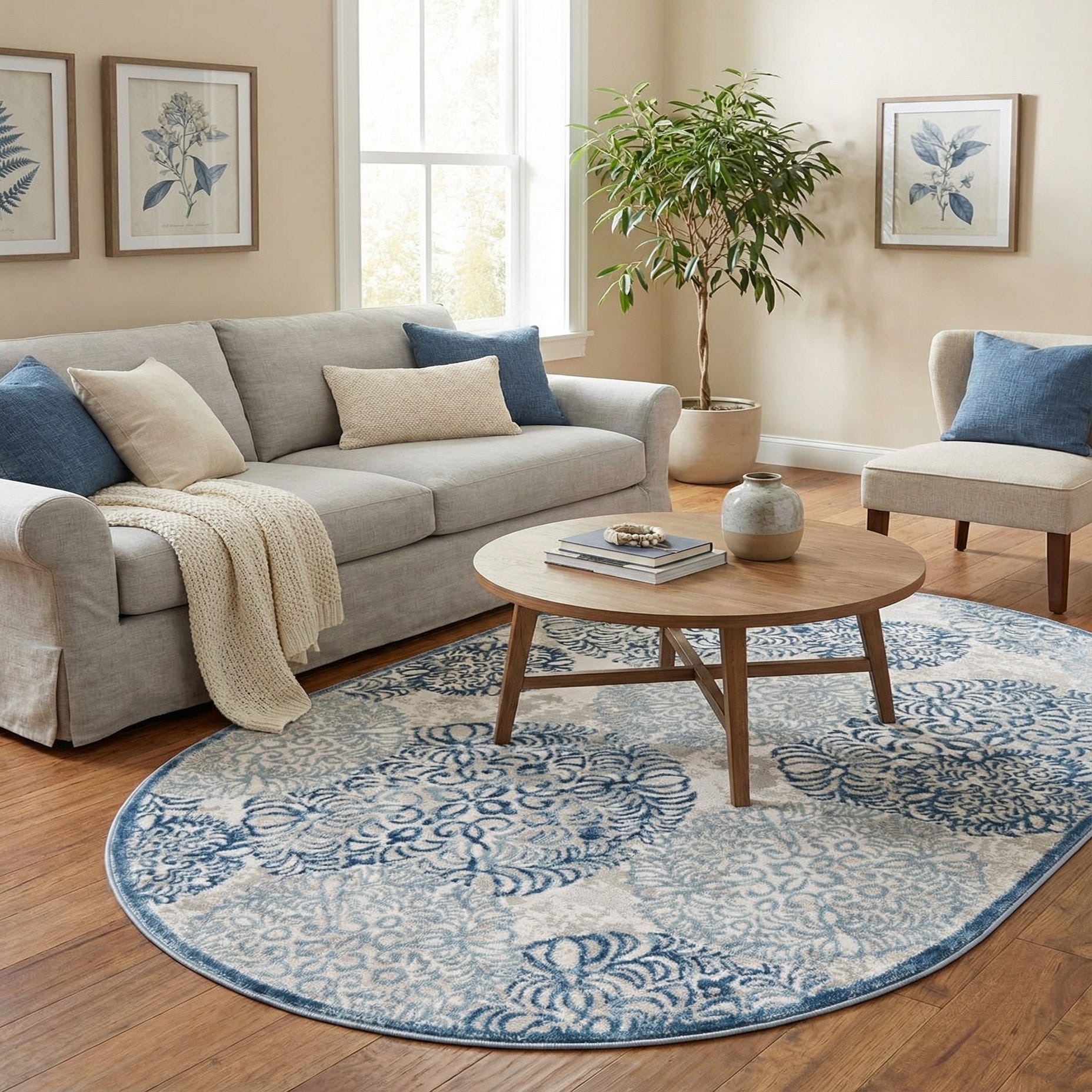 A rounded composition of ornate, overlapping medallions gives this oval rug a lively, yet composed look. The blue ground sets a cool, steady backdrop while filigree-like motifs in light blue and beige create depth and movement across the surface. The pattern balances traditional scrollwork with a modern, airy layout, making it a good fit for transitional and coastal-inspired interiors.
