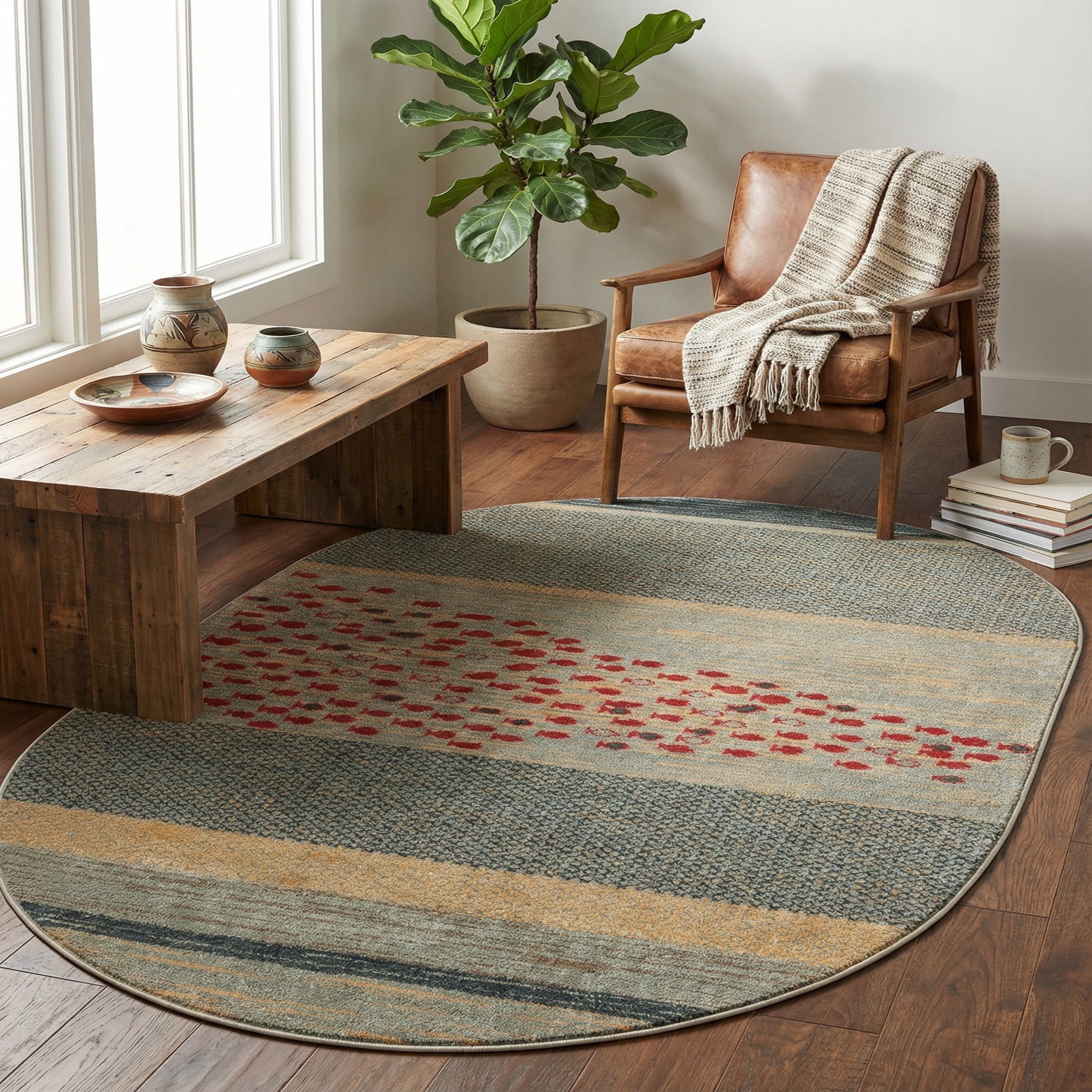 The rug's dense weave offers a smooth texture, and its stain-resistant property makes it a practical choice for high-traffic areas. Its shed-free nature maintains a tidy appearance over time. The blue and beige tones can anchor a room with a calming effect, while the red accents add a subtle warmth, making this piece particularly suitable for living rooms, study areas, and bedrooms that seek a touch of color without overwhelming the space. Its oval shape is ideal for creating a focal point in smaller rooms or adding dimension and interest to a section of larger interiors.
