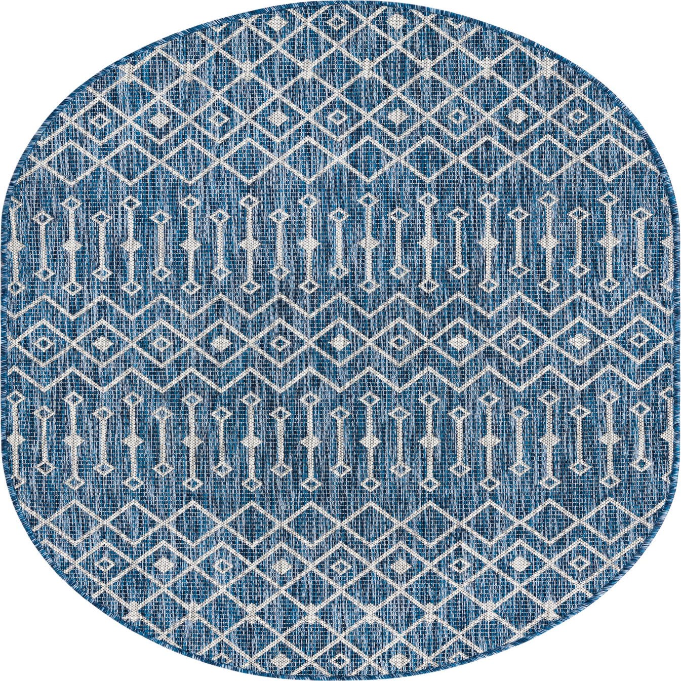 This oval shape works well in compact outdoor rooms, a covered porch, or a breezy dining nook, and pairs naturally with coastal, modern farmhouse, or transitional schemes. Try it under a round bistro table, in front of a patio sofa, or layered over a larger neutral rug to introduce pattern without overwhelming the space. The blue, ivory, and gray palette coordinates easily with whitewashed woods, natural wicker, and neutral upholstery, bringing a composed, lived-in look to both indoor and outdoor settings.