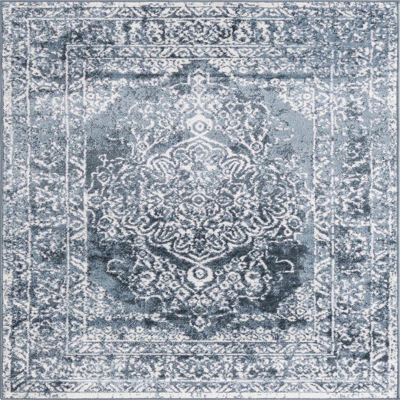 Soft blue provides the backdrop for an ornate ivory medallion and filigree pattern that blends traditional Persian motifs with a gently distressed finish. The layered borders and faded detailing create a vintage-inspired look that still reads fresh and calm. The contrast between the cool blue field and the ivory highlights gives the design depth and a subtle sense of movement across the surface.