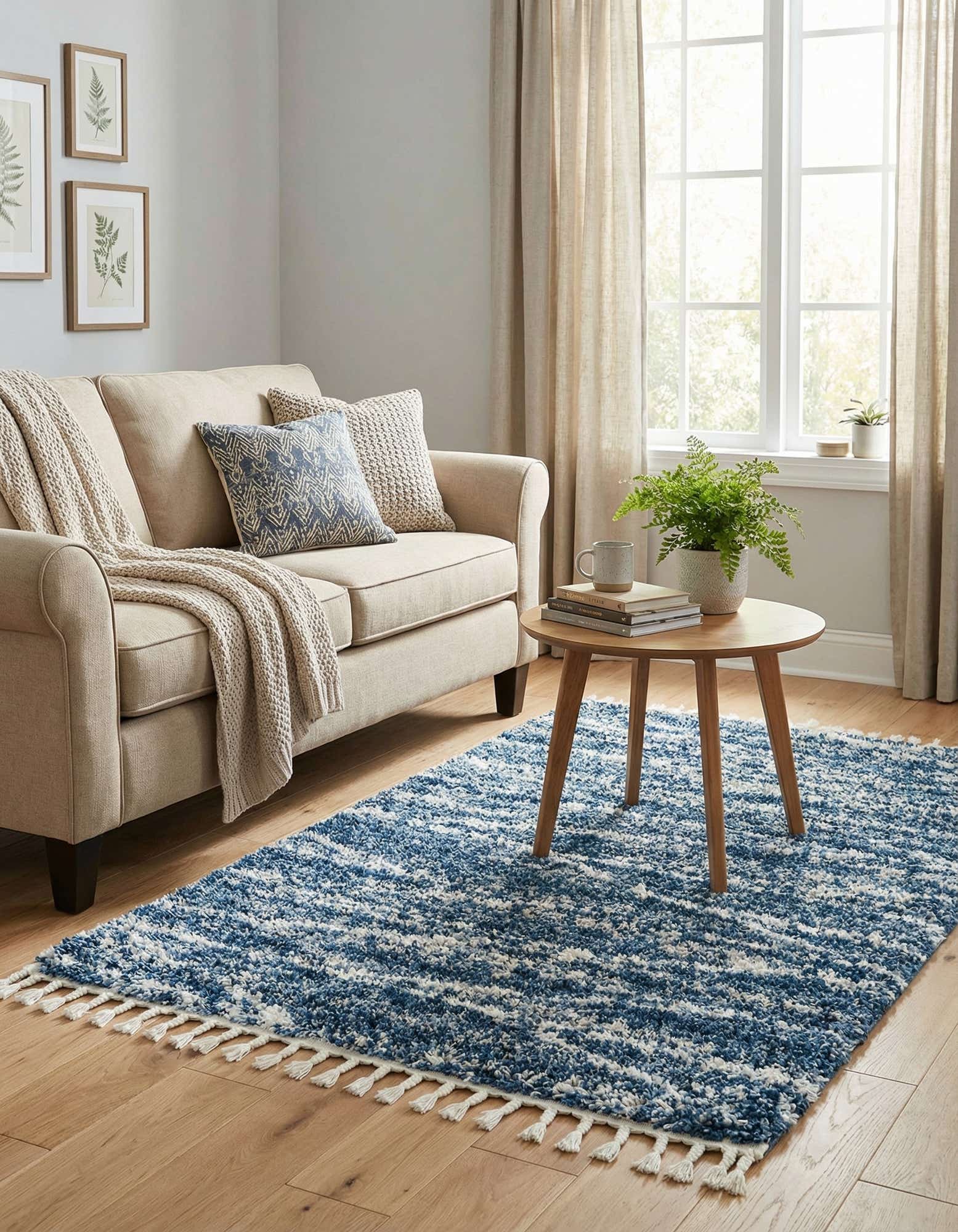 A 4x6 rectangular Serenity Shag rug with a textured blue and white striped pattern, ideal for a living room.