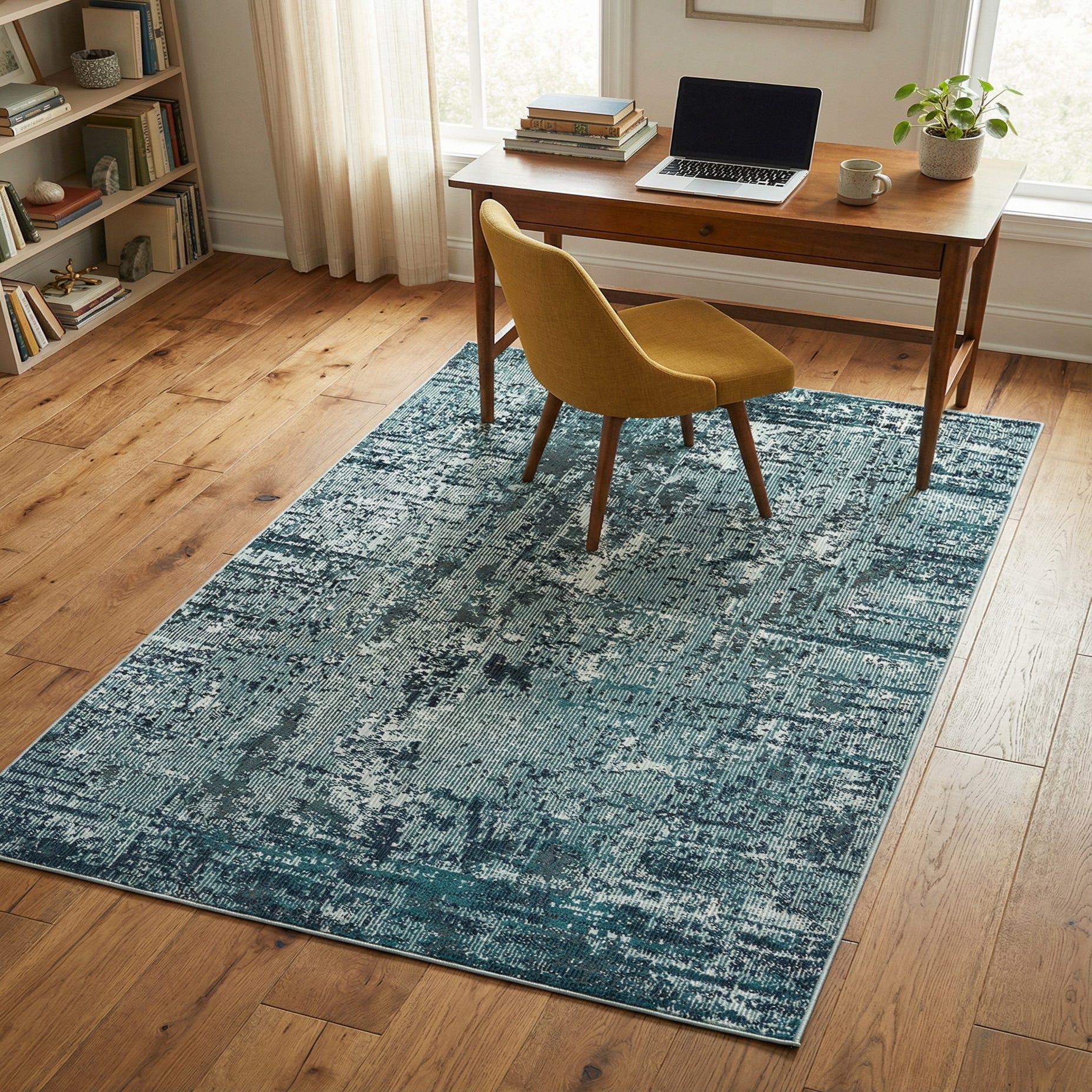 Primary color is Blue. Colors in this rug include: Blue, Light Blue, Gray, Navy Blue.