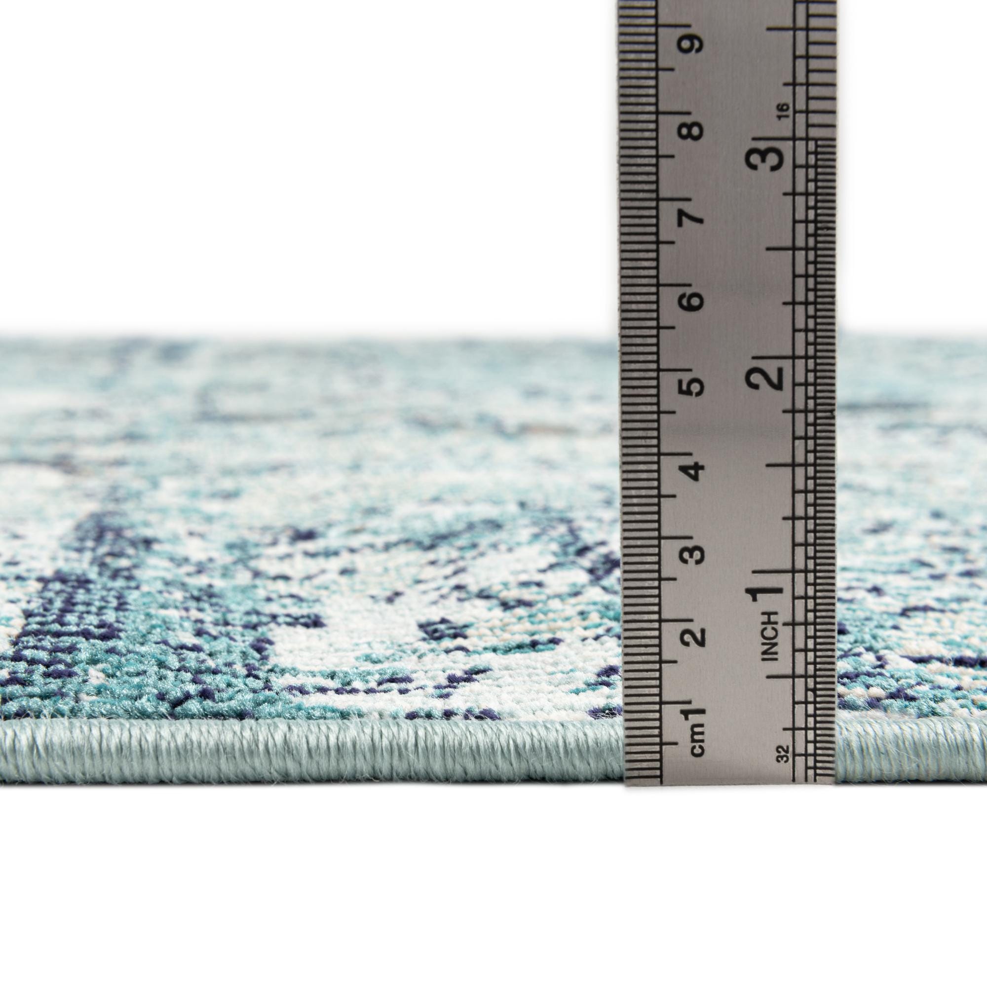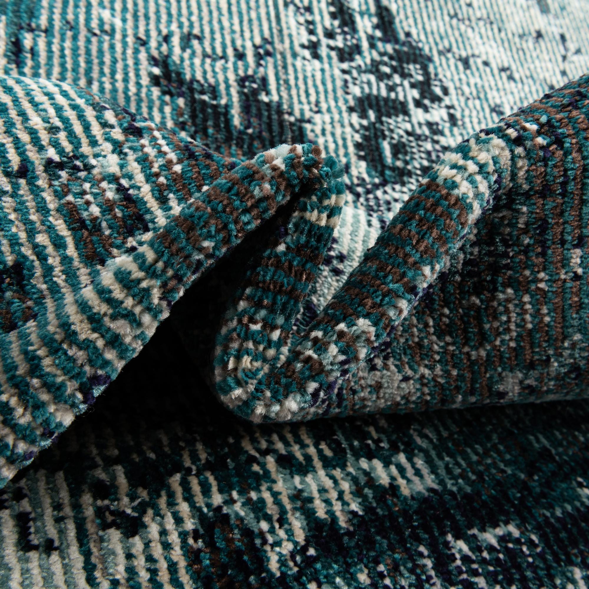 A 4x6 rectangular blue area rug with a textured, abstract pattern featuring various shades of blue and hints of white.