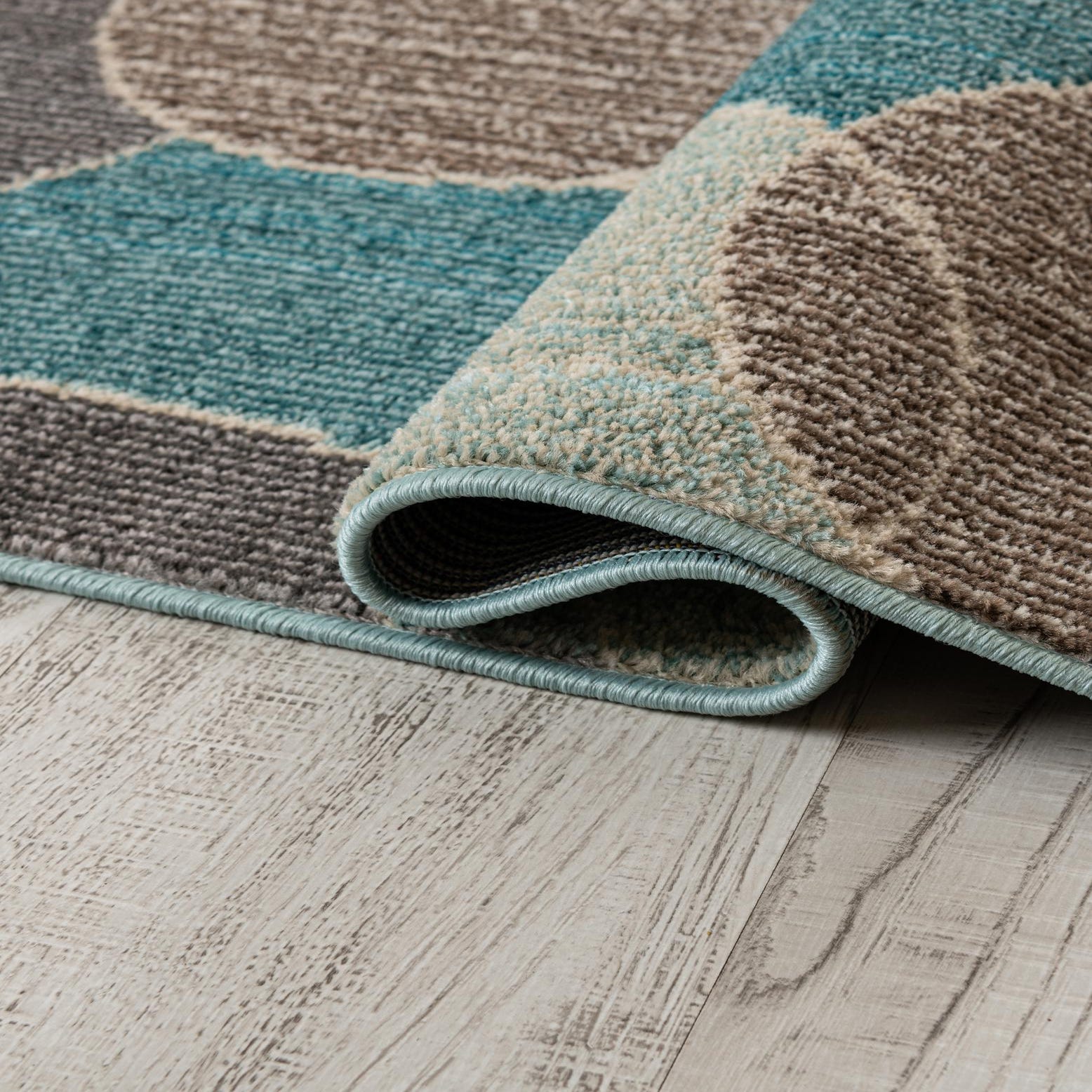 A lively geometric design of overlapping circles plays across a blue ground, mixing navy, beige, brown and touches of green for contrast. The motif alternates solid and subtly striated fills so each circle reads with its own texture and depth; where shapes meet the edges are softly defined, creating a layered, modern look that brings movement without feeling busy. Running your hand over the surface reveals a low-pile, gently ribbed texture that highlights the pattern and keeps the overall feel smooth underfoot.