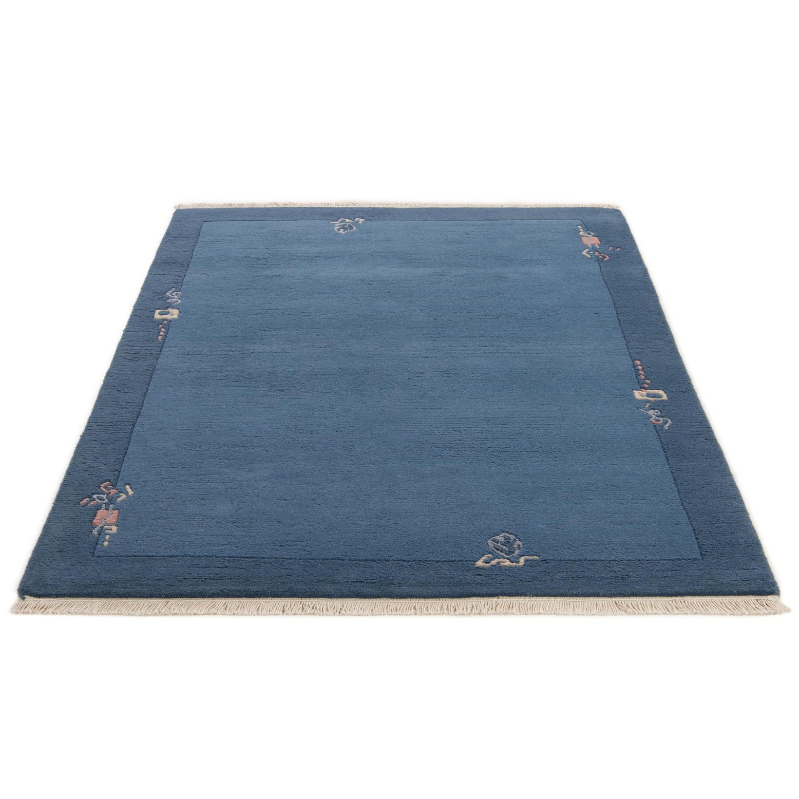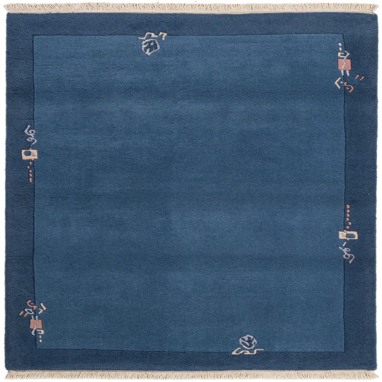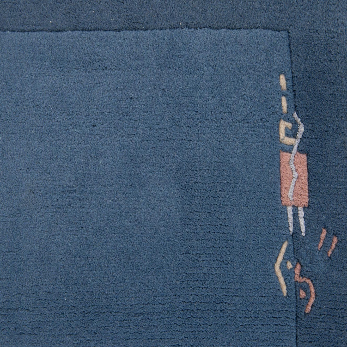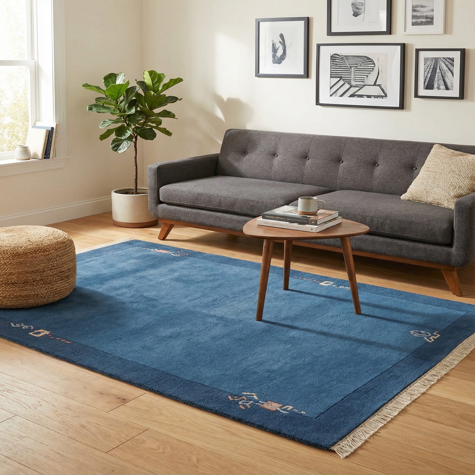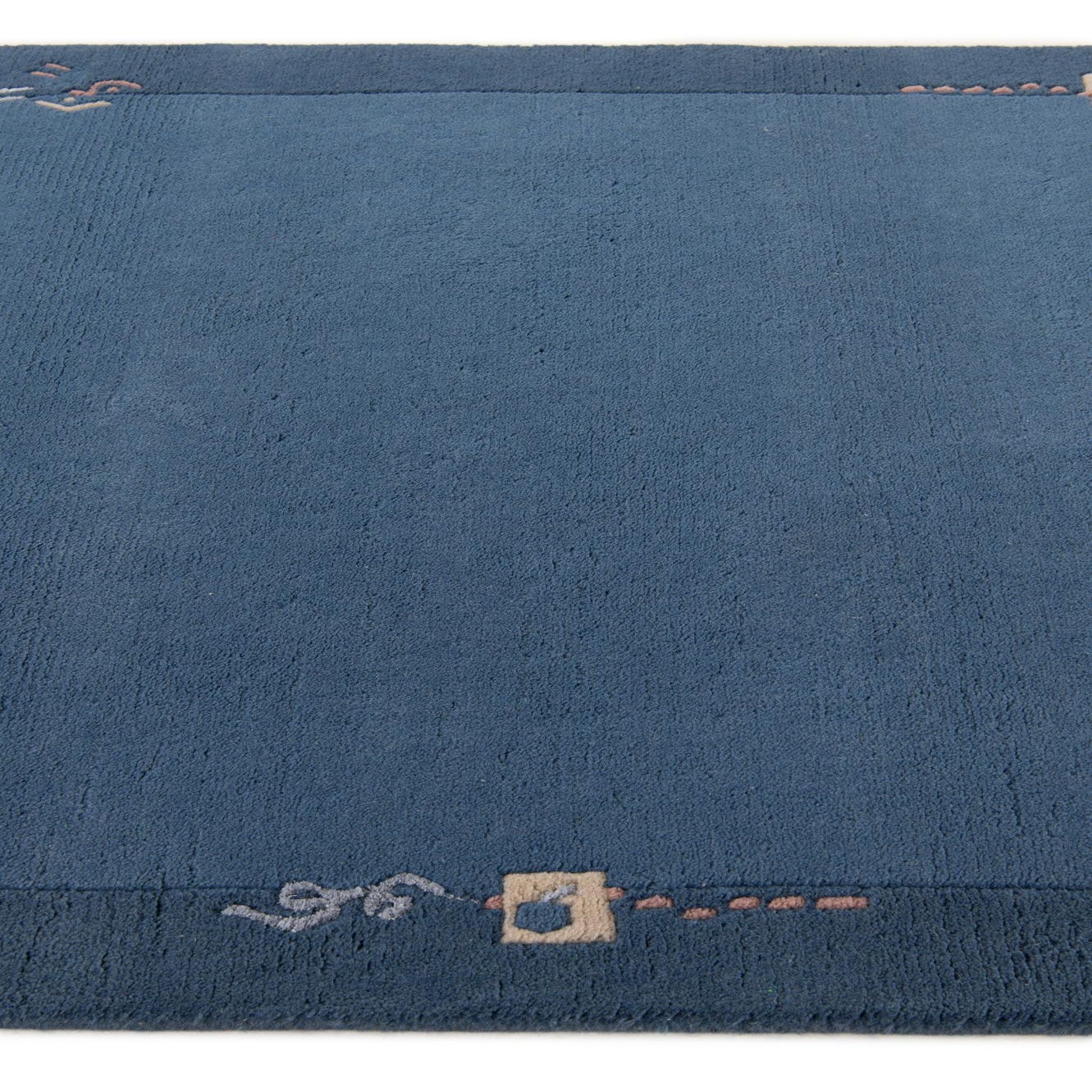 A deep blue field forms a calm, single-color ground with a slightly darker blue inner border and a narrow outer frame. Small, hand-knotted motifs in ivory, light blue and soft pink punctuate the corners and sides, creating a subtle, modern interpretation of traditional detailing. The hand-knotted construction of 80% wool and 20% silk delivers a dense, low-to-medium pile that feels plush underfoot; wool provides resilience while the silk threads add gentle highlights where the light hits, giving the surface a refined, tactile sheen. Short ivory fringe finishes the ends for a classic touch.