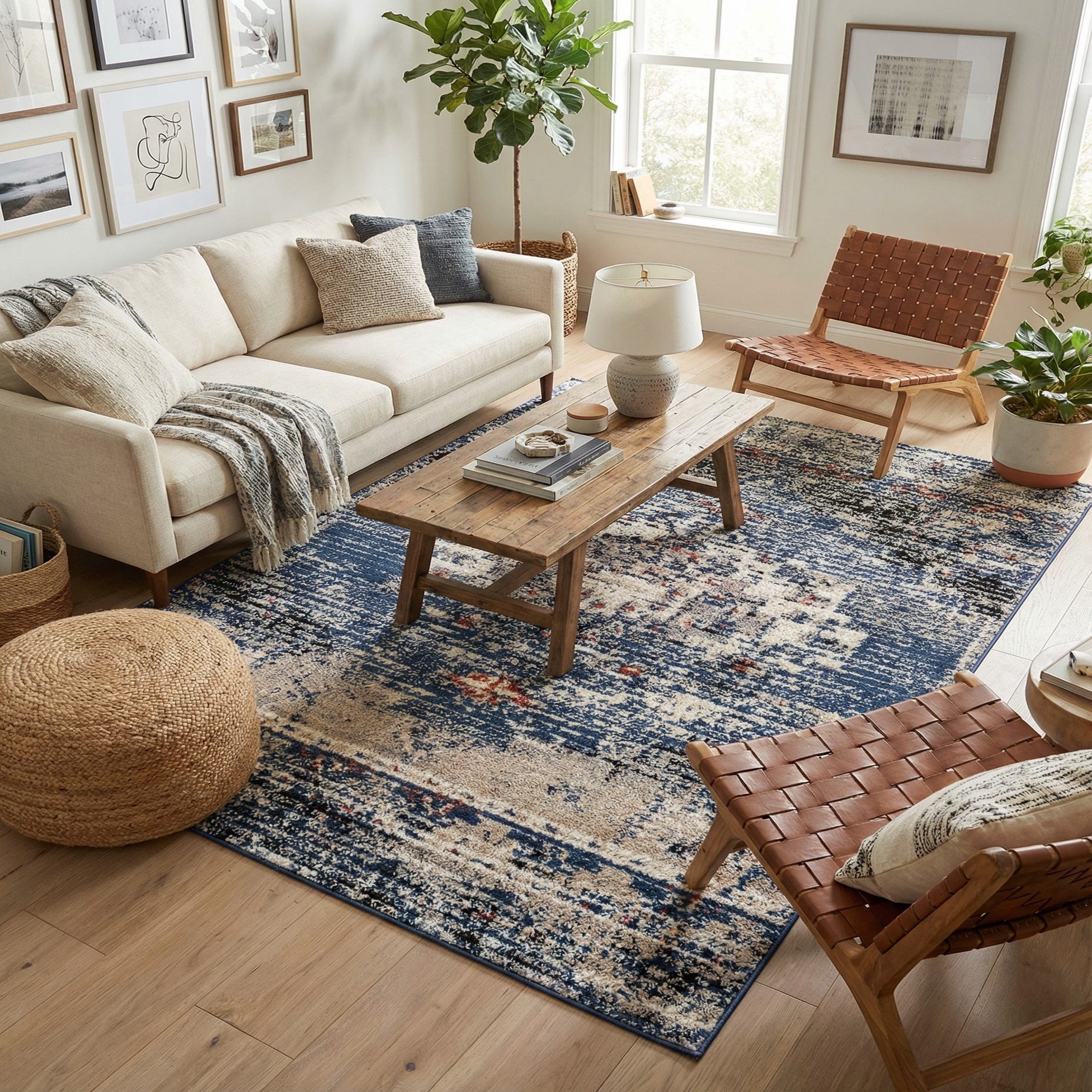This piece works well in casual living rooms, family rooms, or under a modest dining table where you want an anchored focal point without overpowering the space. It pairs nicely with navy or gray upholstery, warm wood furniture, and mixed-metal accents; in a coastal or transitional setting it brings depth, while in a modern farmhouse or industrial loft it adds a worn-in, layered character. Use it to define a seating area, layer over hardwood or tile, or place at an entry to introduce color and texture.