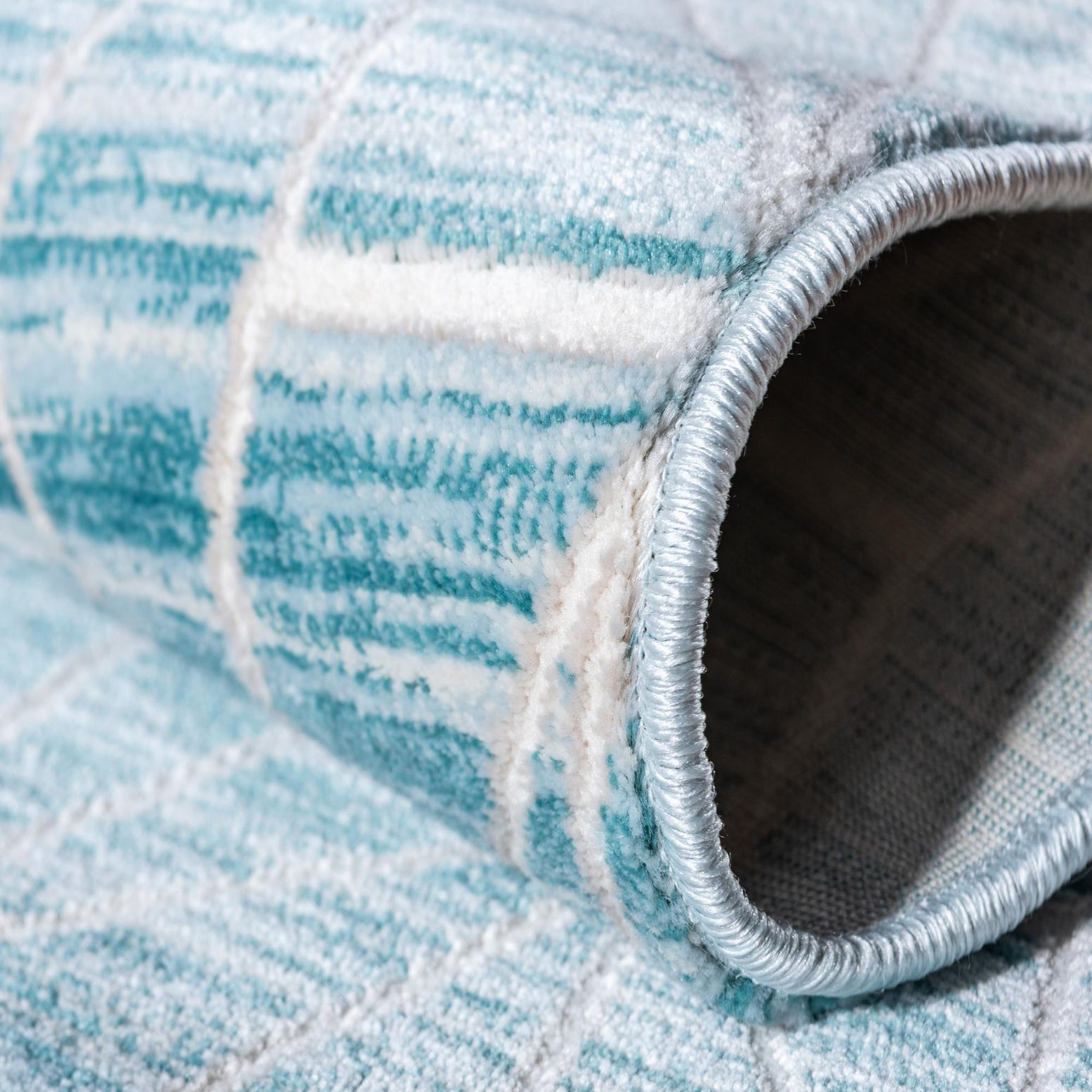 A crisp geometric lattice of beige lines sits atop a layered blue background, creating a contemporary pattern that reads both structured and relaxed. The raised beige motif has a soft, slightly plush texture that contrasts with the flatter, striated blue field, giving the rug subtle dimensionality underfoot. Machine made from 70% polypropylene and 30% polyester, the construction produces a low- to medium-profile feel that stays comfortable while maintaining a clean, tailored appearance.