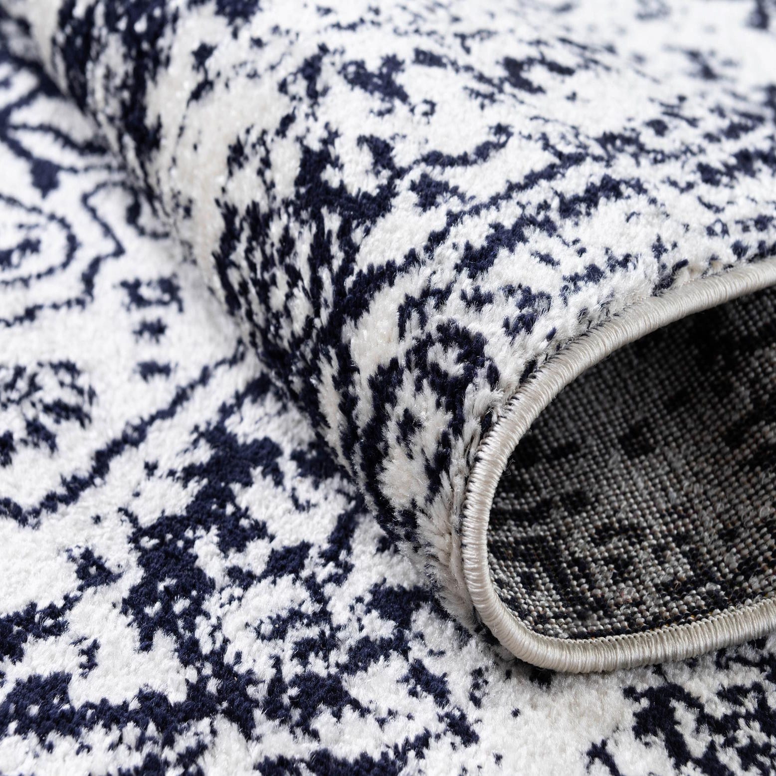 The Arlington collection presents a 5 Ft Octagon rug that offers a modern twist on classic style. This machine-woven piece is crafted from 100% polypropylene, ensuring durability and easy maintenance. The rug features a deep blue background, complemented by a contrasting ivory pattern. Its design showcases intricate floral motifs and ornate borders, reminiscent of traditional Persian textiles. The texture of the rug is smooth with a medium pile that provides a comfortable underfoot experience.