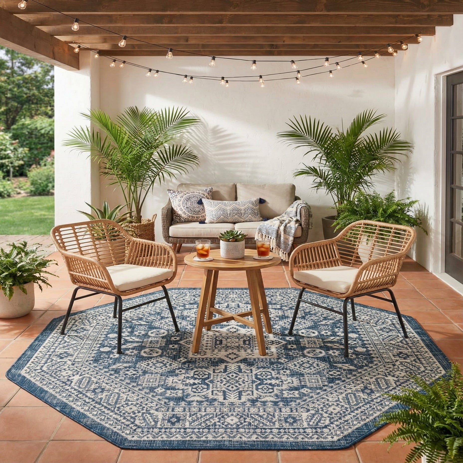 Place this rug on a covered patio or sunroom to define a seating area, beneath a small bistro set, or at an entry to introduce pattern and color. It pairs naturally with weathered teak, woven rattan, and neutral linens for a relaxed, layered aesthetic, or with white-painted metal and navy accents for a fresh, casual outdoor dining setup. The geometric rhythm and compact shape make it a strong choice for cozy conversation spots and informal dining nooks.