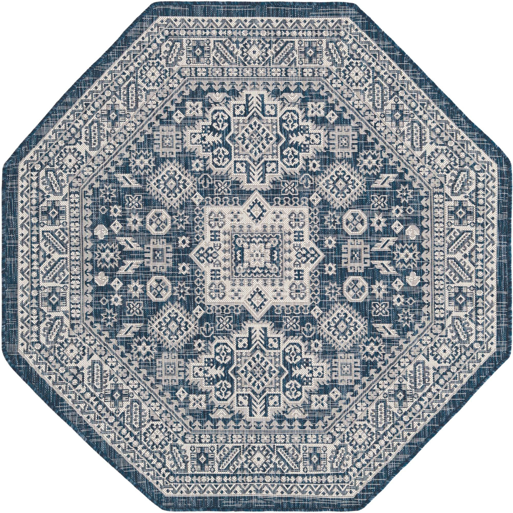 Ivory geometric motifs form a layered medallion and intricate border set against a rich blue background, giving this octagonal rug a distinctly Aztec-inspired look. The machine-made construction in 100% polypropylene produces a low-profile surface with a subtle textured weave that feels firm underfoot and keeps the pattern crisp. Fine crosshatch detailing in the ground adds depth, letting the ivory design read cleanly across the blue field.