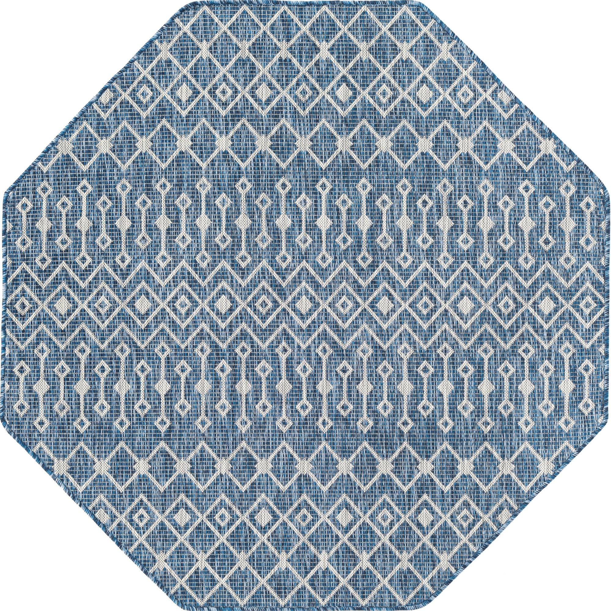 A repeating geometric lattice in soft gray threads sits against a blue background, laid out in alternating bands of diamonds and elongated, columnar motifs. The machine-made construction in 100% polypropylene produces a low-profile, tightly woven surface that feels smooth underfoot with a subtle raised texture where the pattern sits against the field. The octagonal silhouette adds a tailored touch that highlights the rug’s graphic layout.