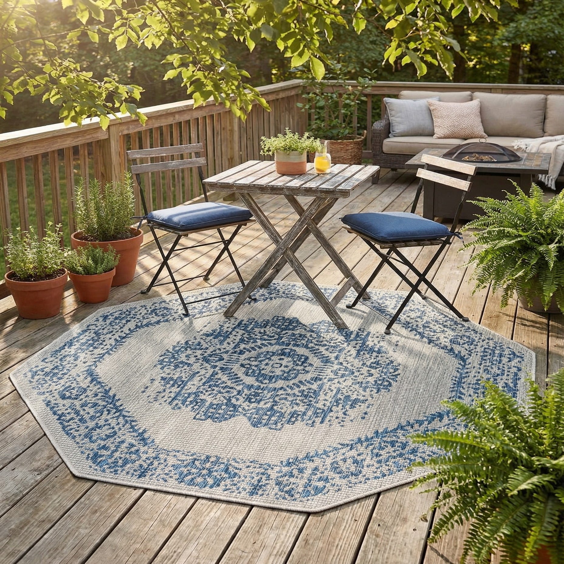 This piece works well on a covered patio or screened porch to anchor a seating area, and it pairs nicely with weathered wood, wicker, or painted metal furnishings. Use it to define an outdoor dining setup, add interest to an entryway, or layer beneath a bistro table where the octagonal shape echoes round or square pieces. The blue-and-gray palette complements coastal, cottage, and modern farmhouse schemes while bringing a measured, traditional look to contemporary outdoor spaces.
