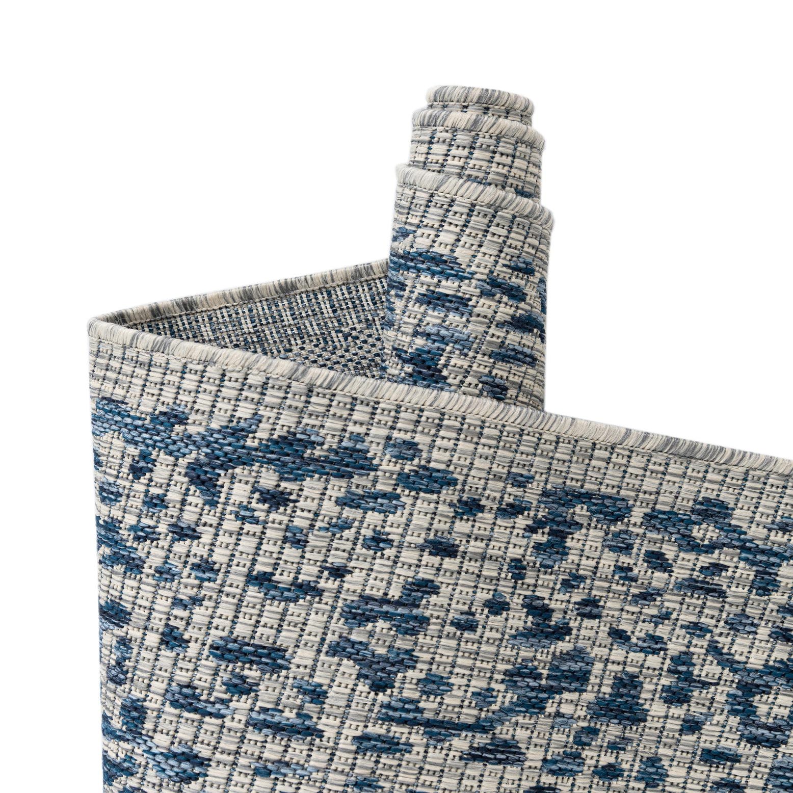 A traditional medallion pattern is reinterpreted here with a clean, architectural octagon that highlights a central floral motif and an ornate border. The background is blue, with gray motifs woven across the surface to create soft contrast and visual texture. Machine made of 100% polypropylene, the rug has a low-profile, tightly woven texture that feels slightly textured underfoot while maintaining a crisp, outdoor-ready appearance.