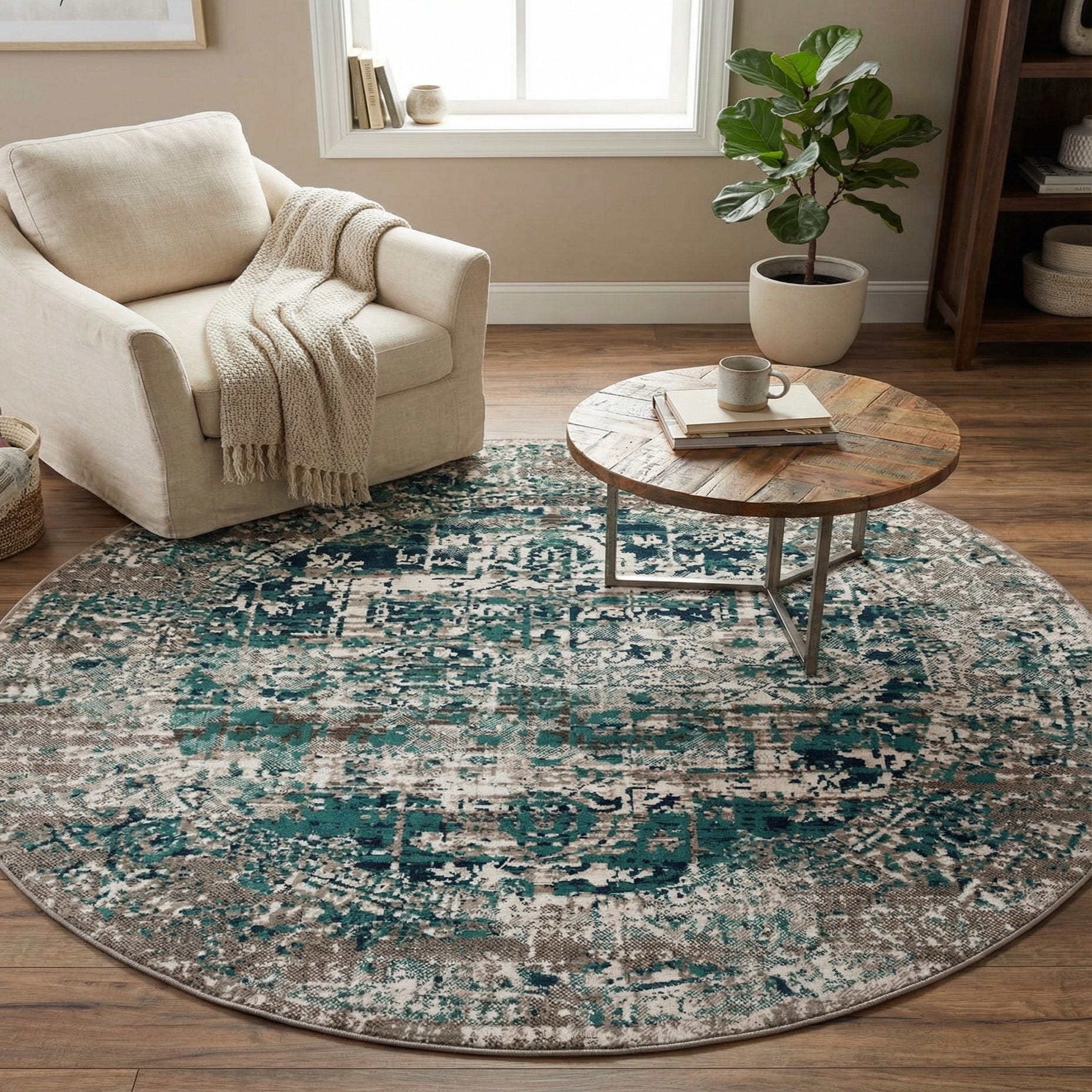 Machine made from 100% polypropylene, the rug has a low-profile pile with a smooth, slightly dense hand that holds the pattern definition and keeps the overall silhouette neat. Its color mix and round shape work well under a circular dining table, as an anchor in a cozy seating area, or layered in a bedroom or entryway; it pairs nicely with light-wood furniture, neutral upholstery, and teal or gray accent pieces for a cohesive, modern-transitional look.