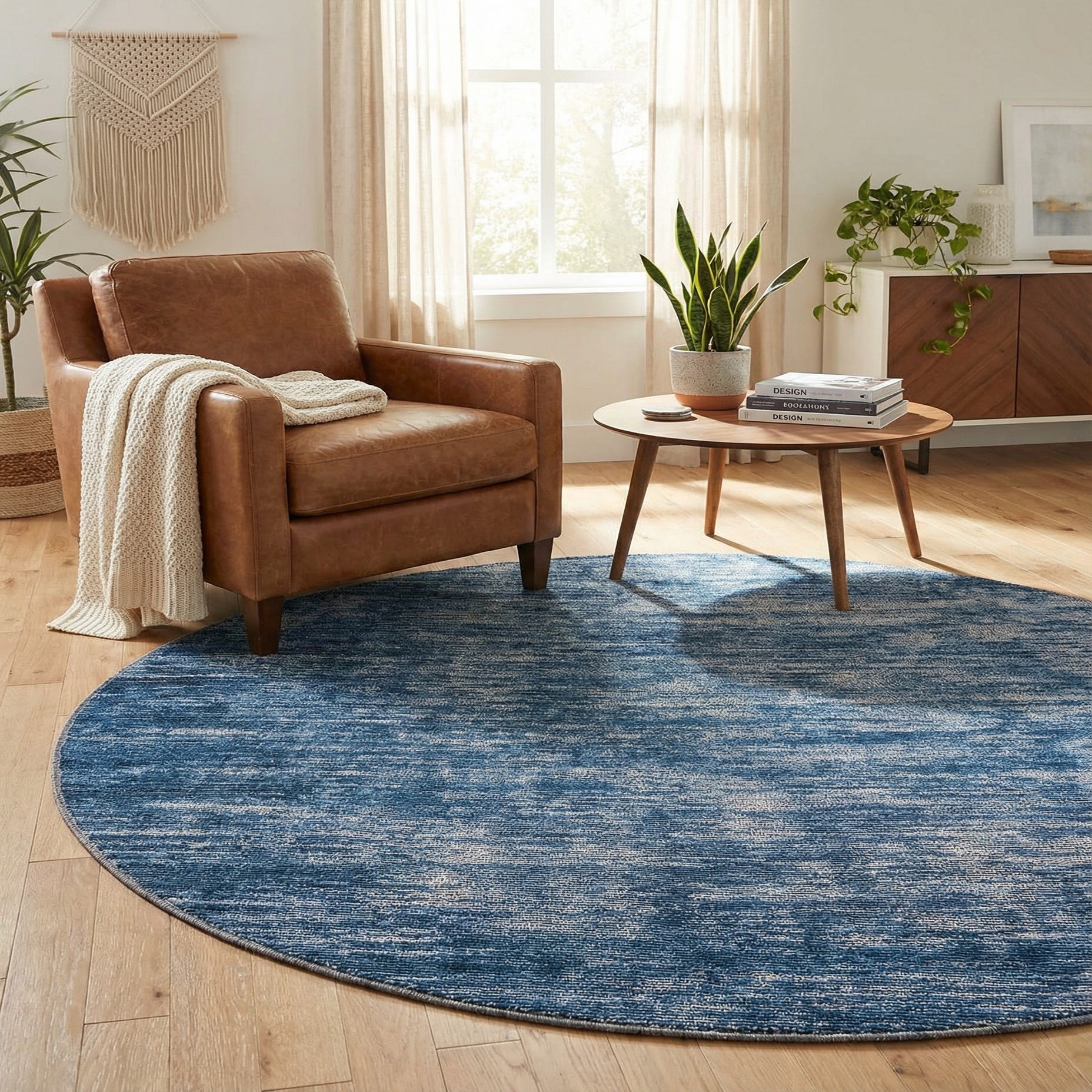 This round piece works well to define a small seating group, sit beneath a bistro or round dining table, or add warmth to a bedroom reading nook. It pairs naturally with light wood furniture and ivory textiles for a coastal or modern casual look, and coordinates nicely with matte black metal accents and streamlined silhouettes in contemporary or transitional spaces.