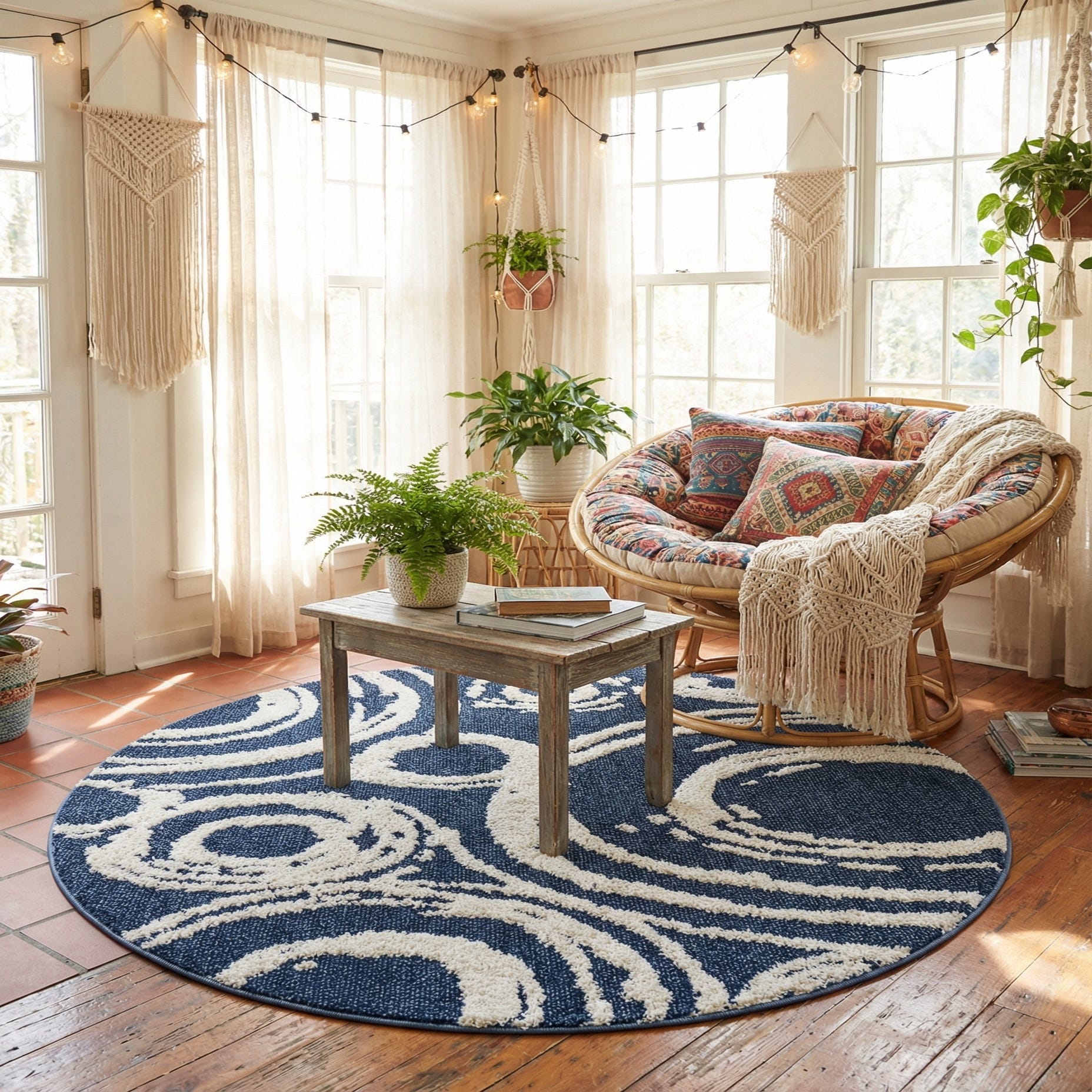 A deep blue field provides a calm, graphic backdrop for ivory concentric rings and brushstroke swirls that flow across the surface. The oversized circular motifs give the rug a modern bohemian look—clean and organic at once—while the ivory pattern is rendered in a plusher pile that sits slightly raised against the tighter, low-profile blue ground. That contrast creates visible depth and a tactile surface you can feel beneath your feet.