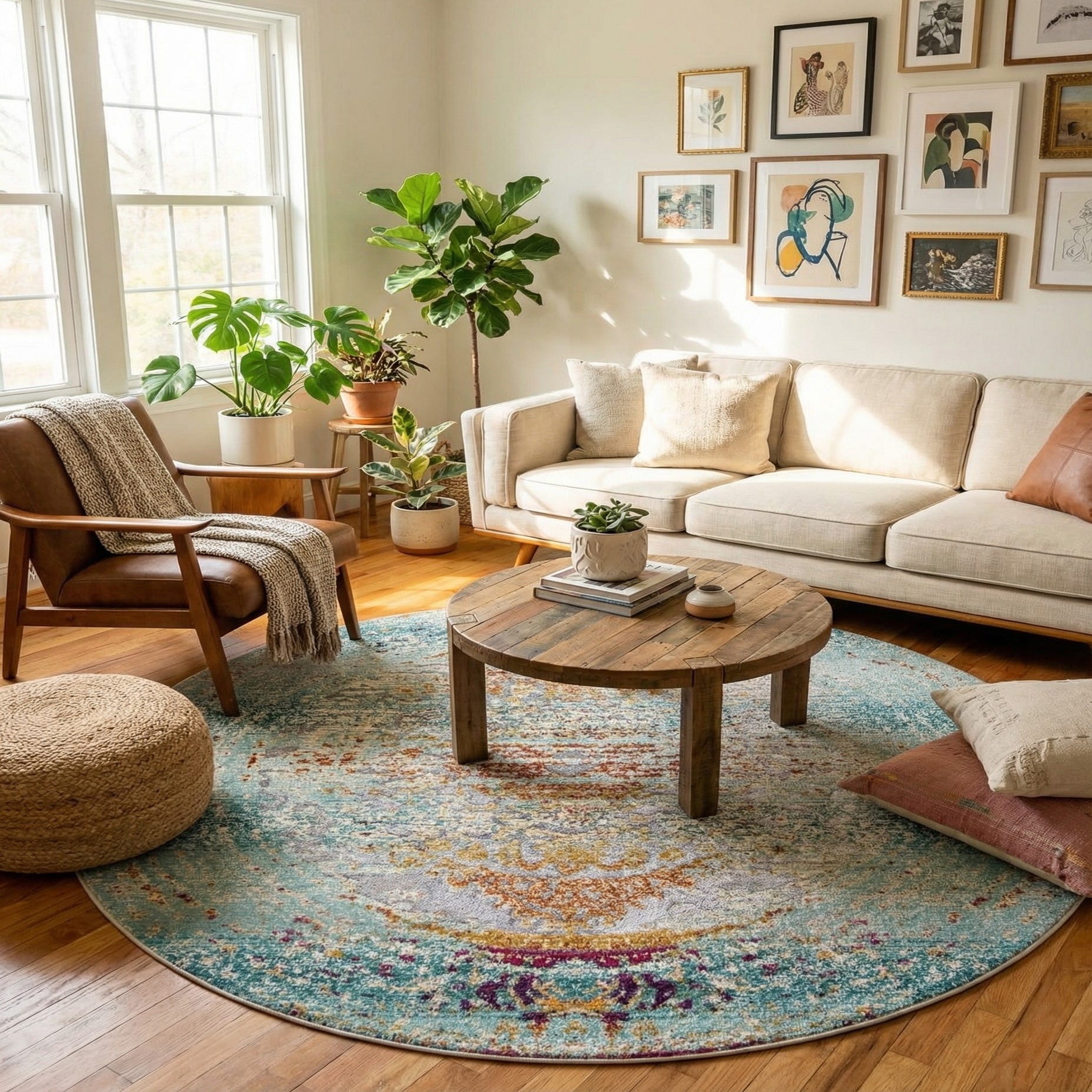 A round 5' 0 x 5' 0 blue bohemian rug with a distressed medallion pattern in teal, gold, and magenta.
