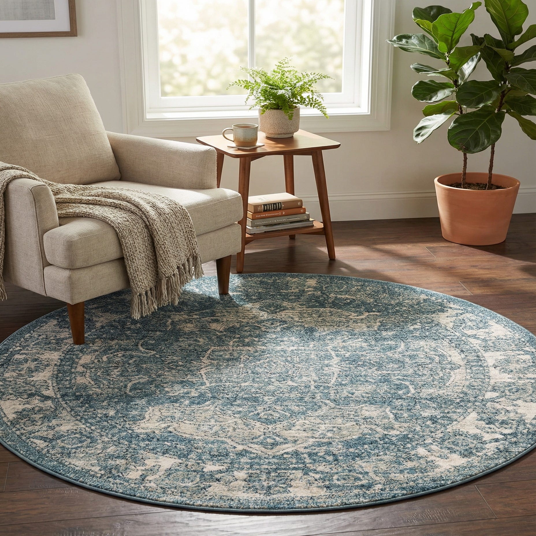 Machine-made from polypropylene and polyester, this round piece works well as an anchor for a small dining nook beneath a round table, a cozy reading corner beside a chair, or layered over hardwood in a living area to introduce pattern without overwhelming the room. It pairs particularly well with light- to medium-toned woods, navy or neutral upholstery, and transitional or coastal-inspired decor where a soft, timeworn look complements streamlined furniture.