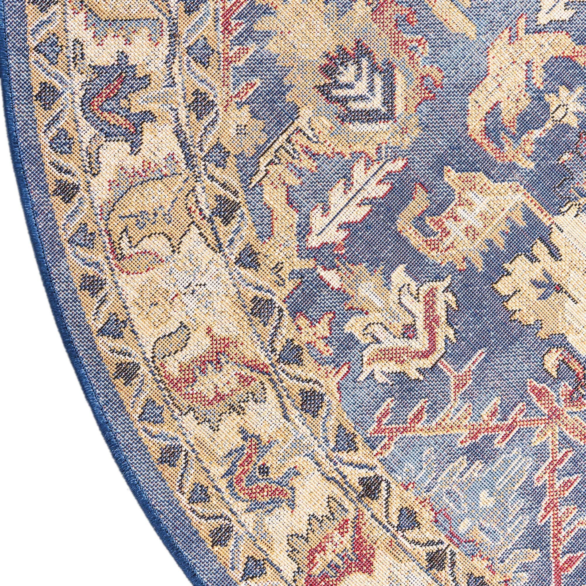 A traditional, oriental-inspired round rug with a deep blue field and a balanced arrangement of stylized floral and palmette motifs. Warm beige and ivory forms anchor the design, while black outlines and red accents add definition and contrast. A coordinated beige-gold border frames the piece, giving the overall pattern a classic, structured look that reads both rich and approachable when placed in a room.