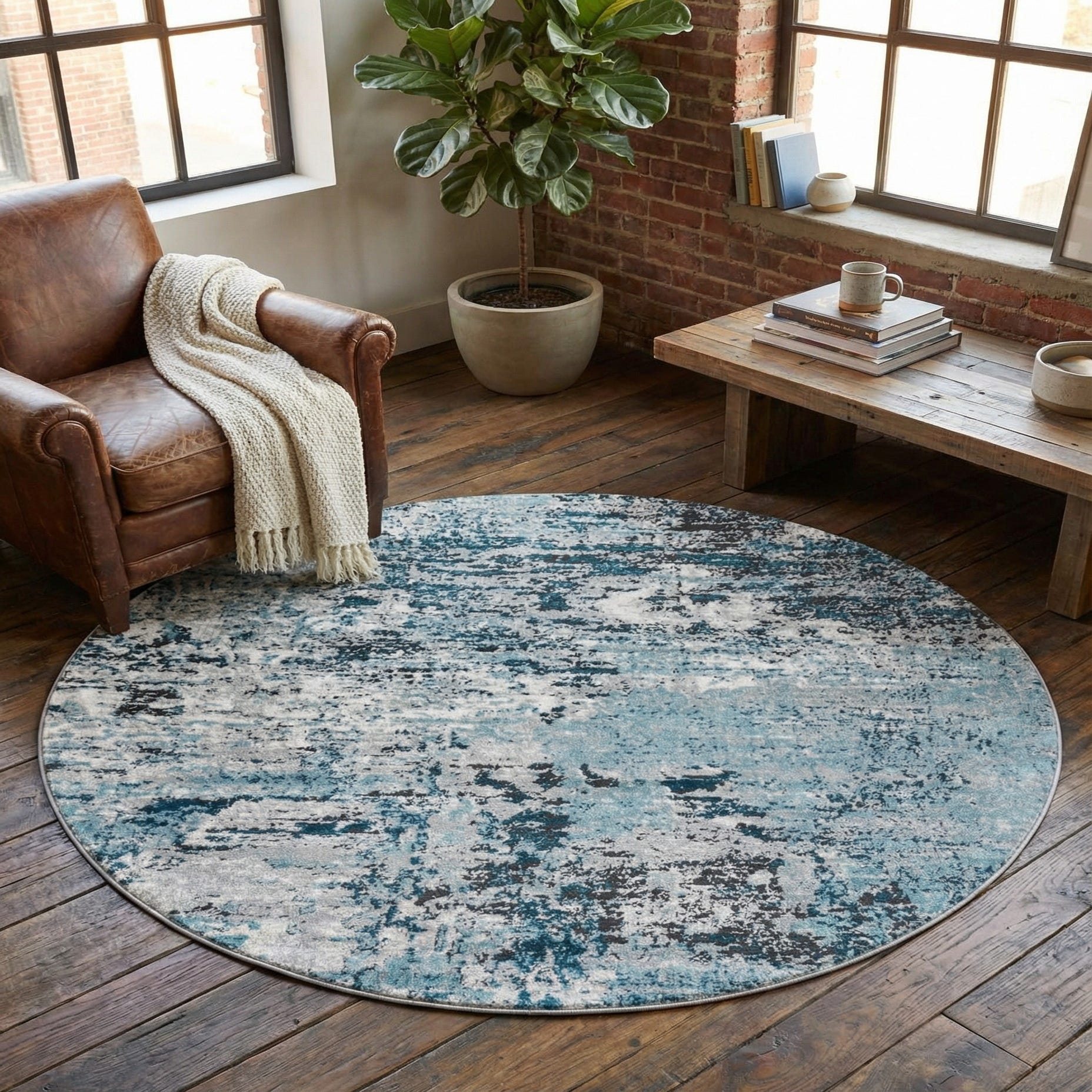 The Leipzig Collection offers a contemporary 5-foot round rug that seamlessly blends with various design aesthetics. Machine-woven with a durable mix of 75% polypropylene and 25% polyester, this rug presents a versatile color palette including tones of blue, gray, ivory, and light blue, set against a predominant blue background.