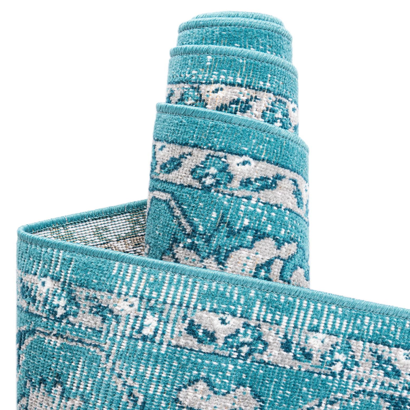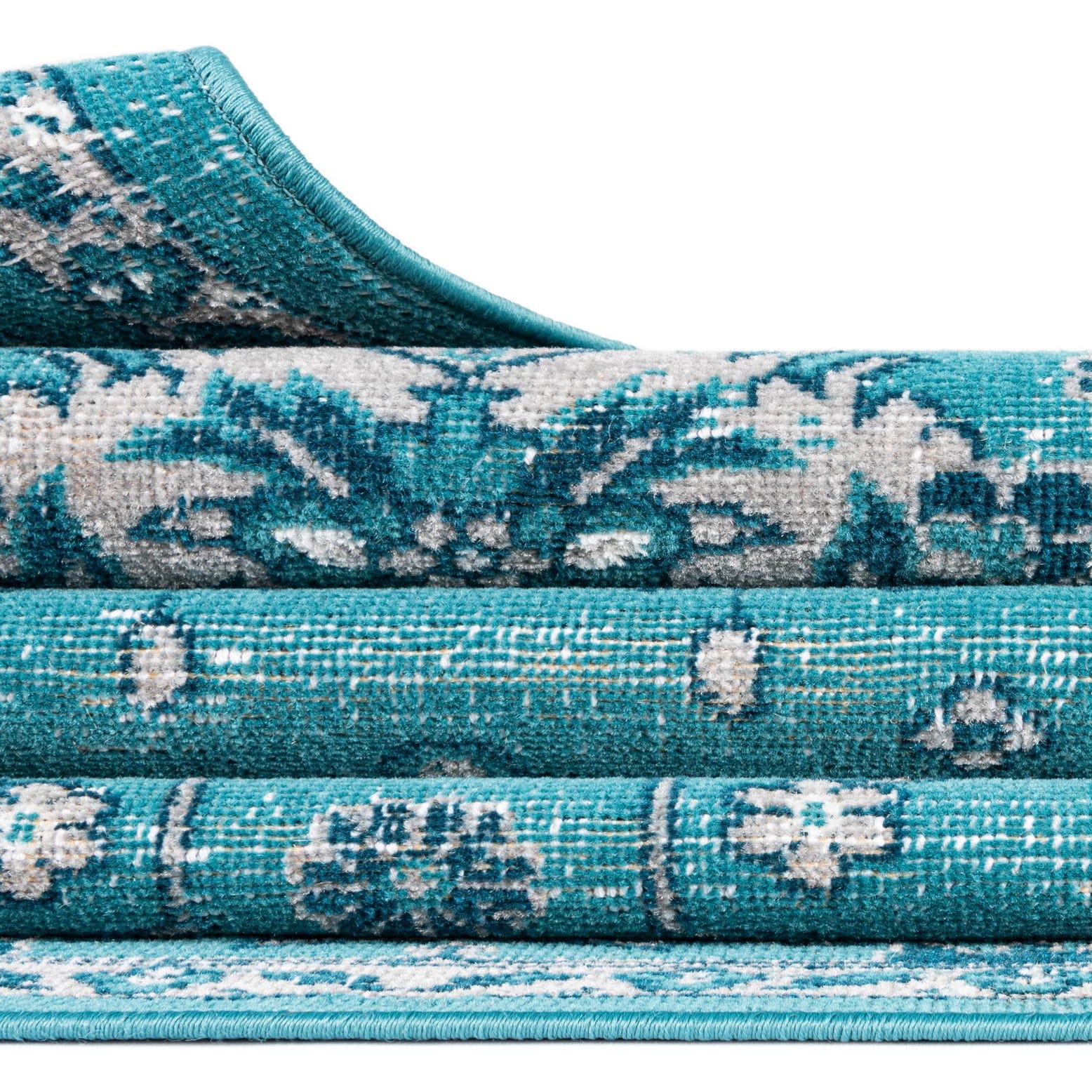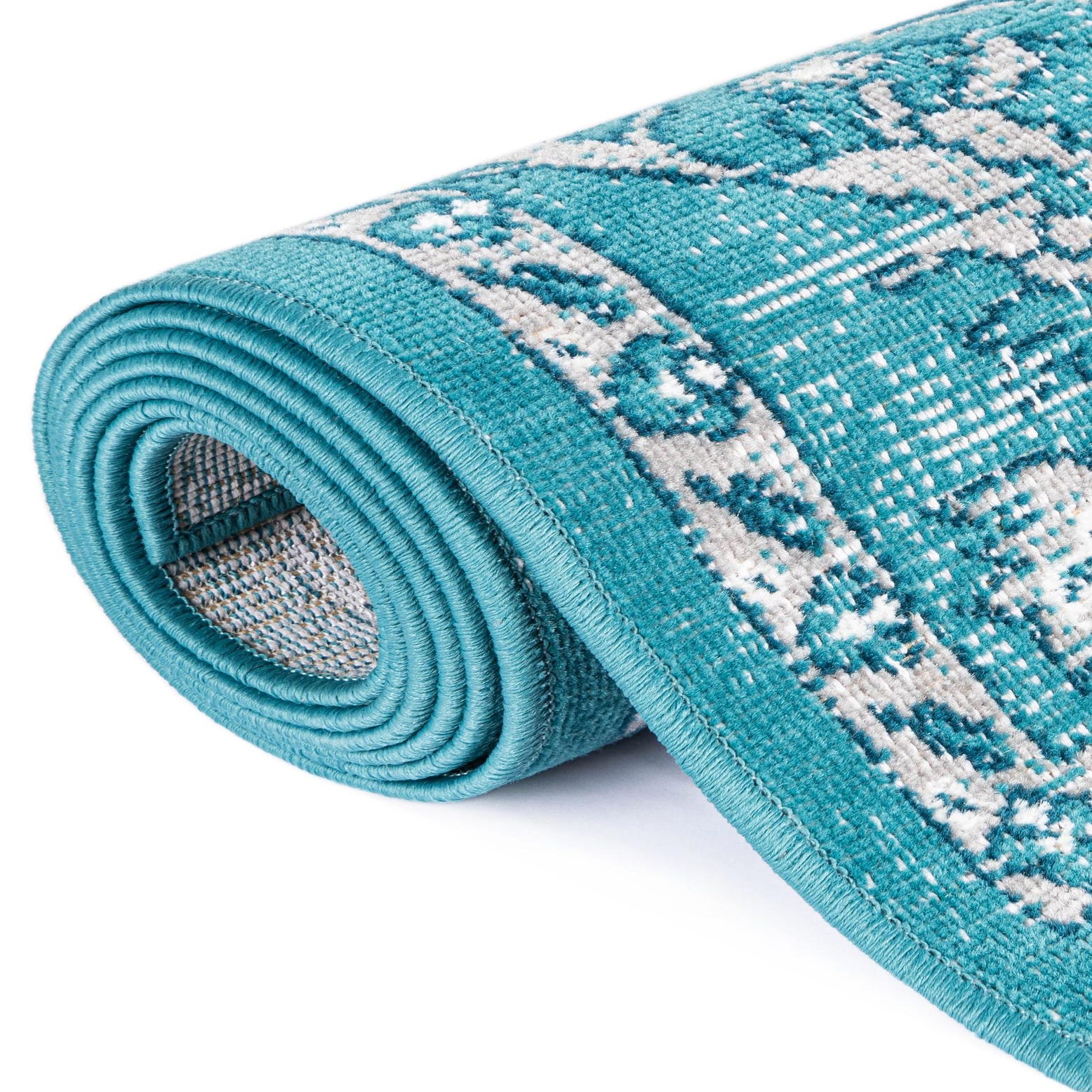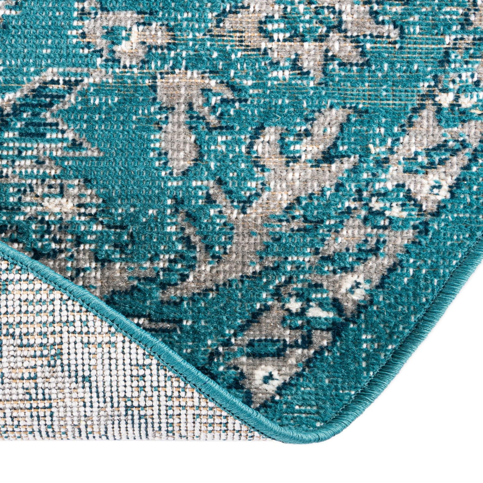 A round, machine-made rug woven from 100% polypropylene, this piece presents a Persian-inspired medallion and floral vine pattern set against a clear blue background. Ivory, gray, and navy blue accents define the central medallion, scrolling arabesques, and a composed border, with a gently distressed treatment that softens the contrasts for a lived-in look. The low-profile pile has a smooth, slightly cushioned hand that feels comfortable underfoot and lies flat beneath furniture.