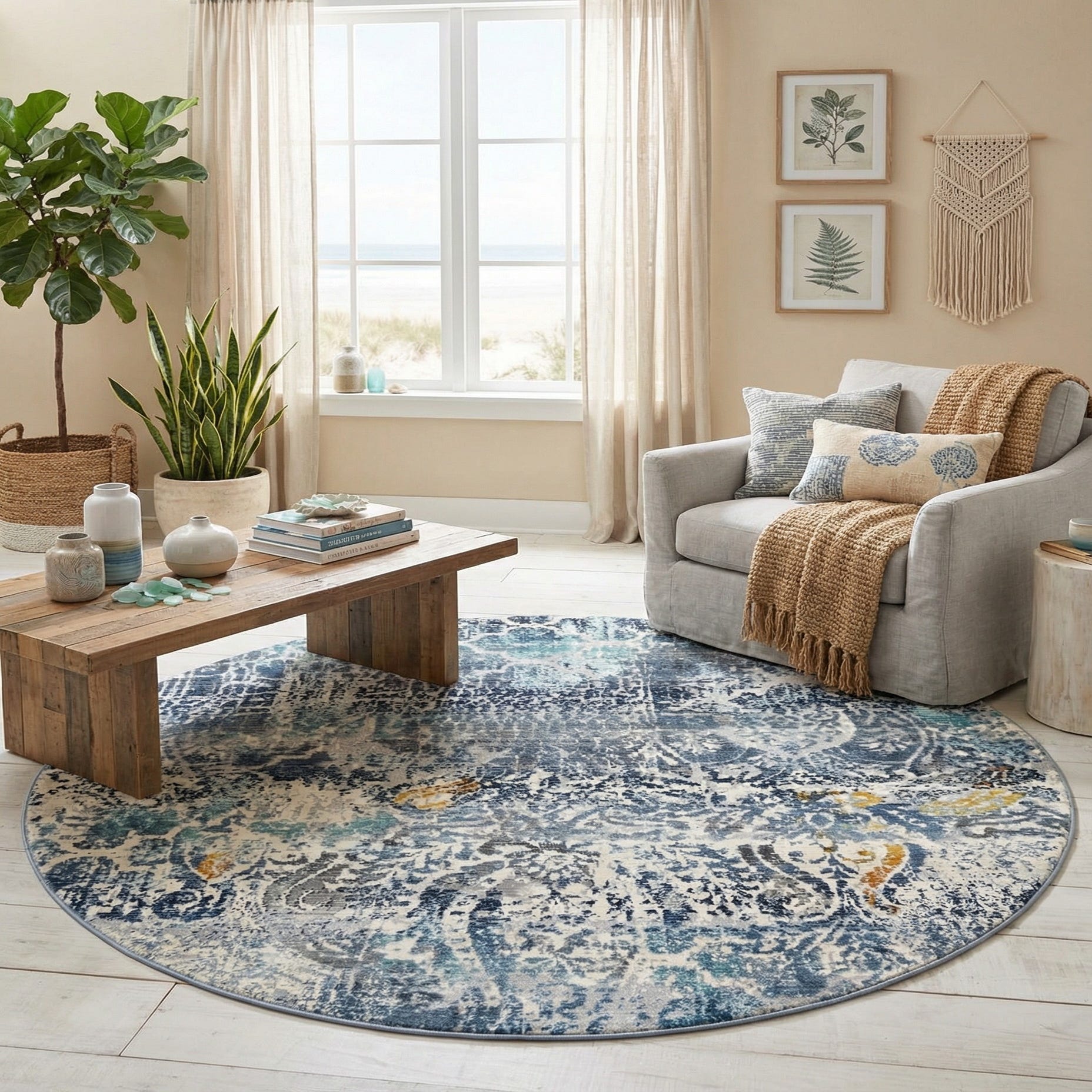 This rug fits well in coastal and transitional settings, pairing naturally with whitewashed wood, linen upholstery, or navy seating for a relaxed living room. It also works under a round dining table or as a defining piece in a bedroom seating area, where the blue palette and subtle gold touches complement gray textiles and metallic accents.