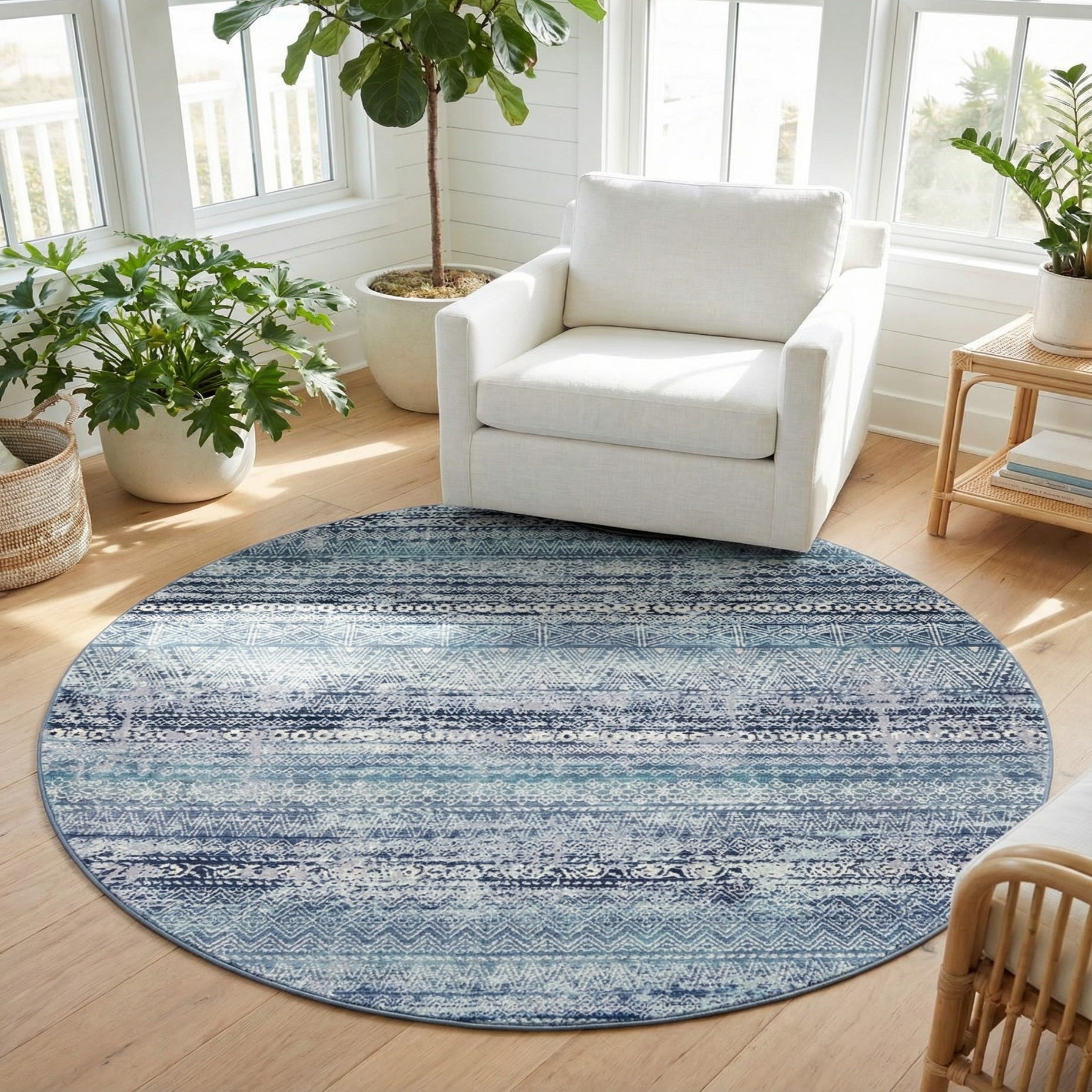 This round shape works well beneath a small dining set, at the base of a cozy seating group, or anchored in a bedroom or reading nook. Pair it with whitewashed wood, navy throw pillows and natural woven accents for a coastal-modern feel, or use it to introduce cool tones into a contemporary or transitional living space. It also layers nicely over hardwood or tile to add color and pattern without overwhelming the room.