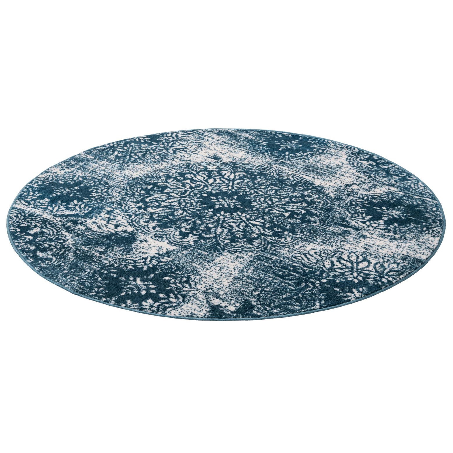 The Monte Carlo collection presents a refined round rug, machine woven from 100% polypropylene, offering durability and easy maintenance. This 5 ft round rug features a dynamic blue and ivory palette, with the blue providing a rich backdrop for the intricate ivory distressed pattern.