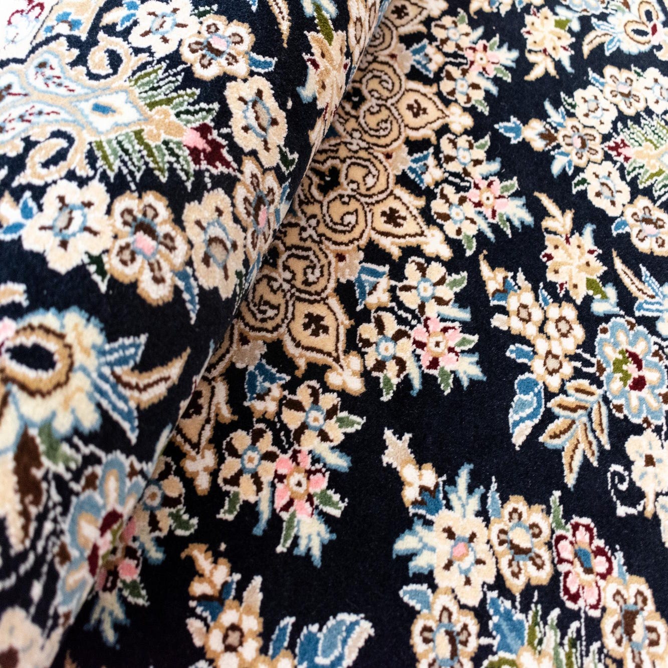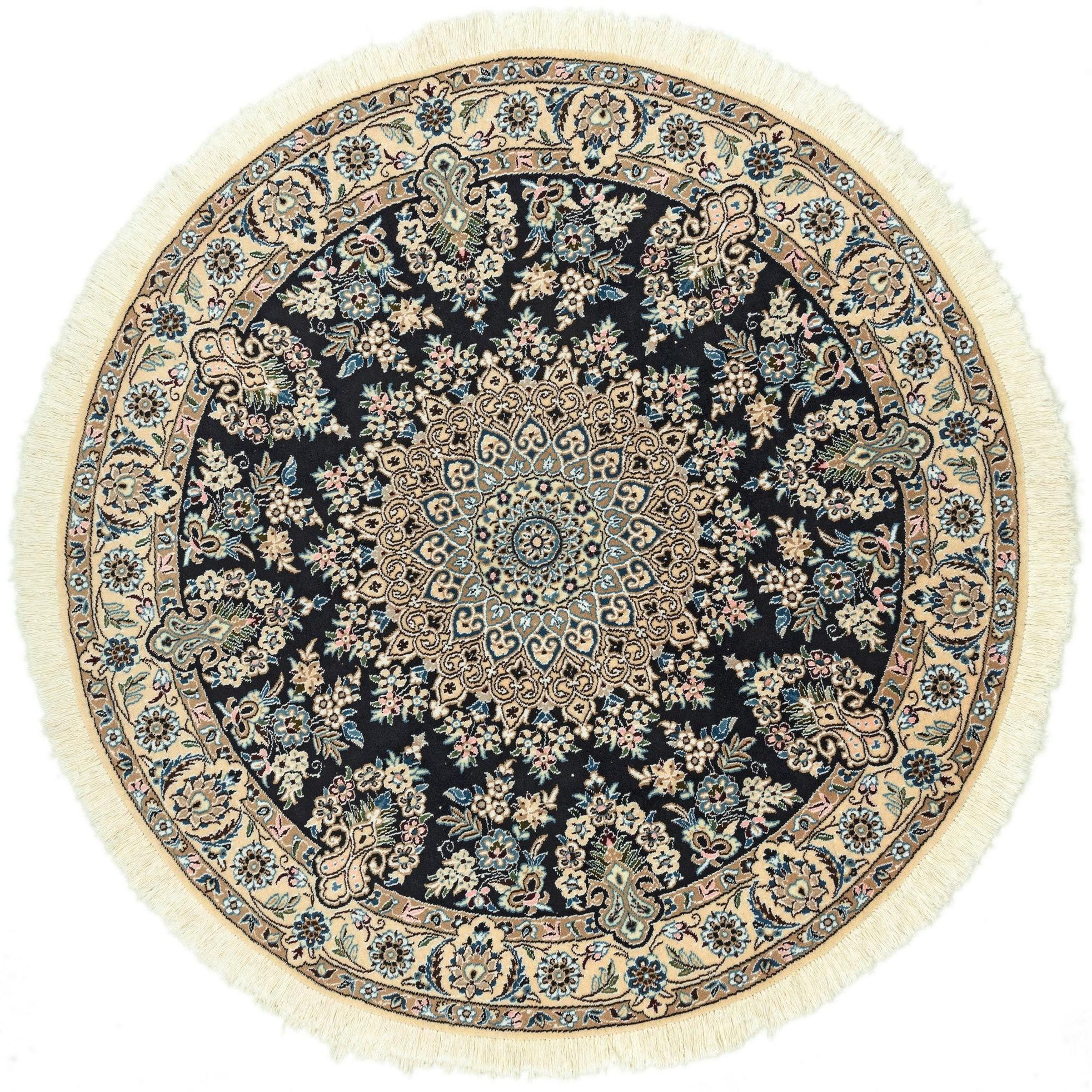 The Nain Collection presents a 5 Ft Round rug, handcrafted from wool with silk accents, offering a sumptuous feel and a lustrous sheen. This rug features a deep blue background complemented by a beige border, creating a sophisticated color palette that can anchor any room. The pattern is intricate, showcasing detailed florals and traditional Persian motifs that are meticulously woven to create an elegant and timeless design.