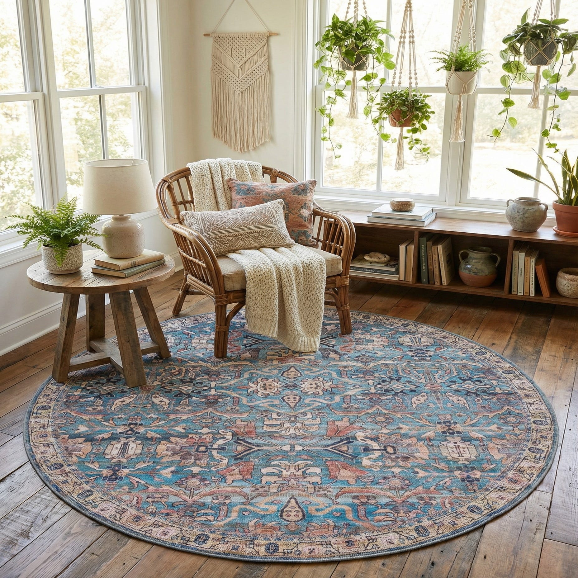 Primary color is Blue. Colors in this rug include: Blue, Beige, Black, Gray, Light Blue, Light Brown, Navy Blue, Peach, Pink.