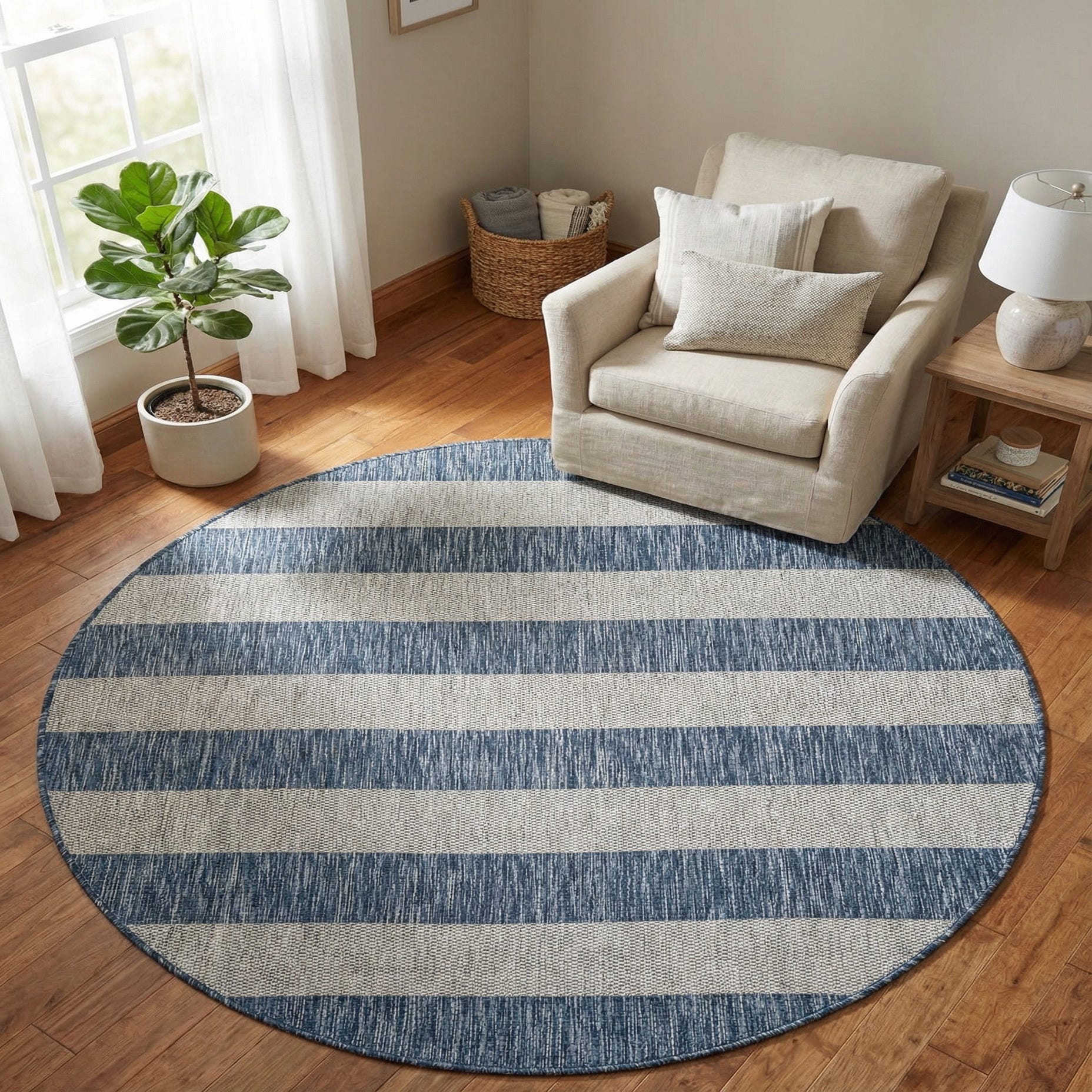 Clean, wide ribbon stripes run across a round blue ground, alternating with ivory bands for a crisp, classic look. The blue areas show a slightly slubby woven texture that gives depth and visual interest, while the ivory stripes have a tighter basketweave feel. Machine-made from 100% polypropylene, the rug has a low-profile, flatweave surface that feels sturdy with a subtle texture underfoot.