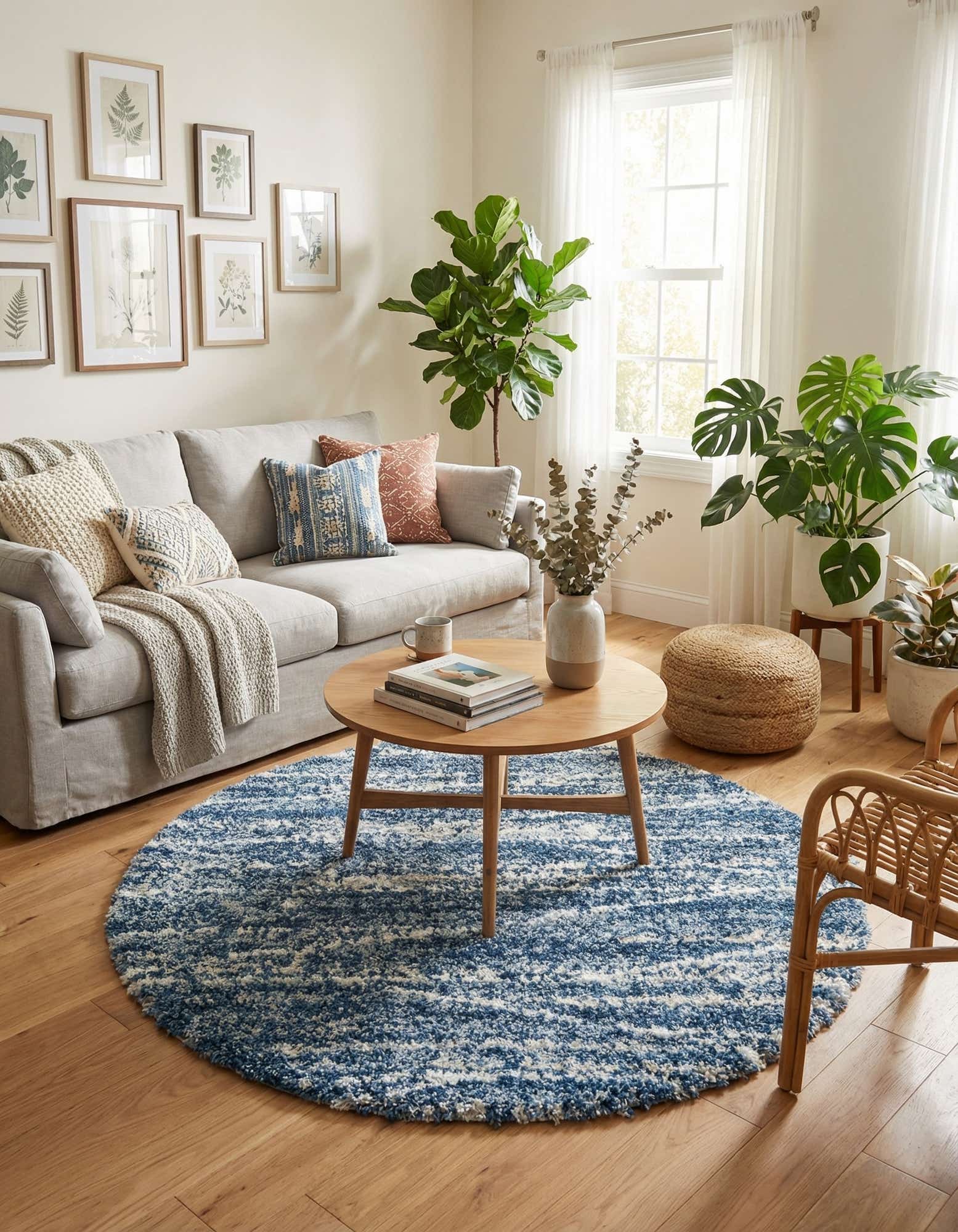 A 5' 3 round blue shag rug with textured white and light blue stripes, perfect for a modern living space.