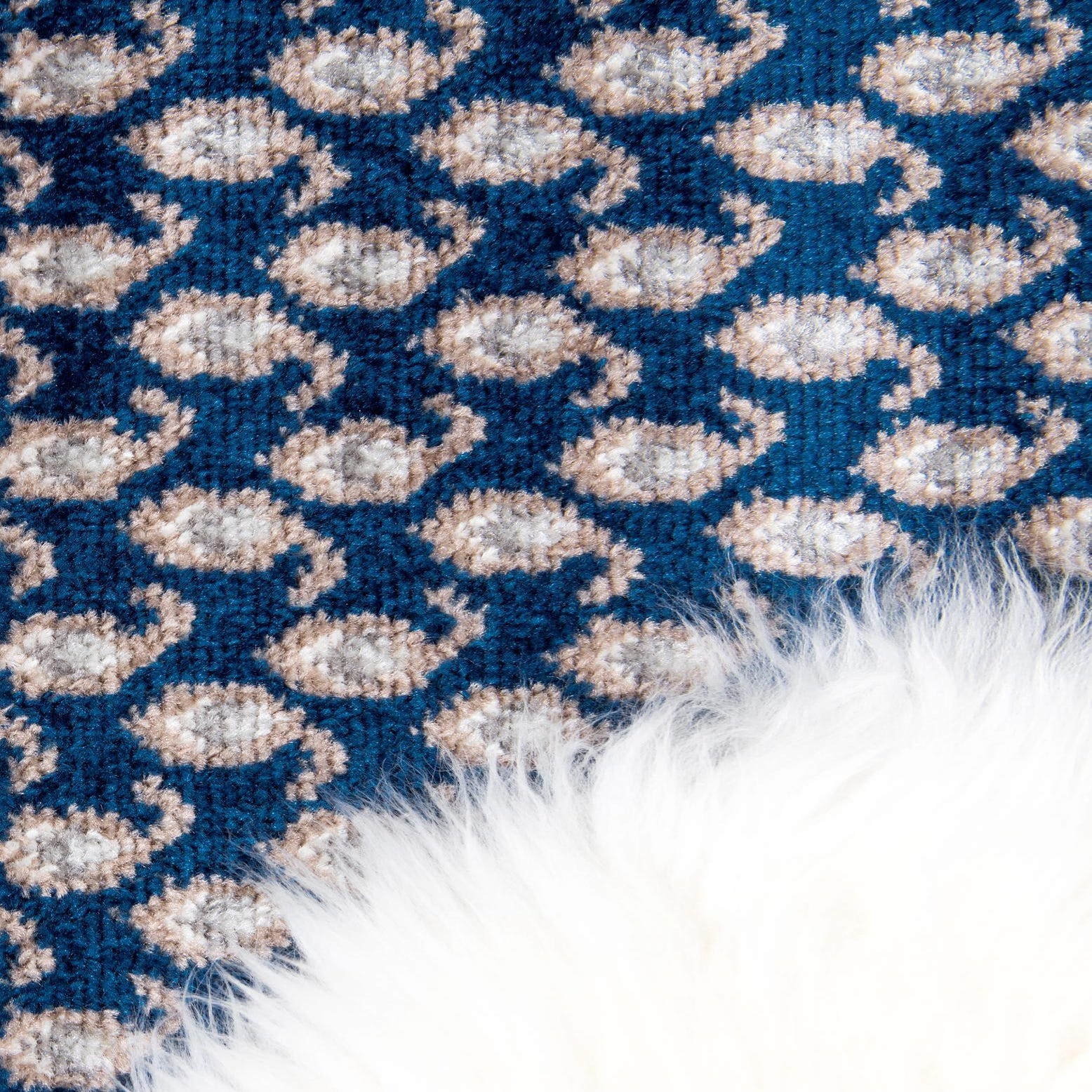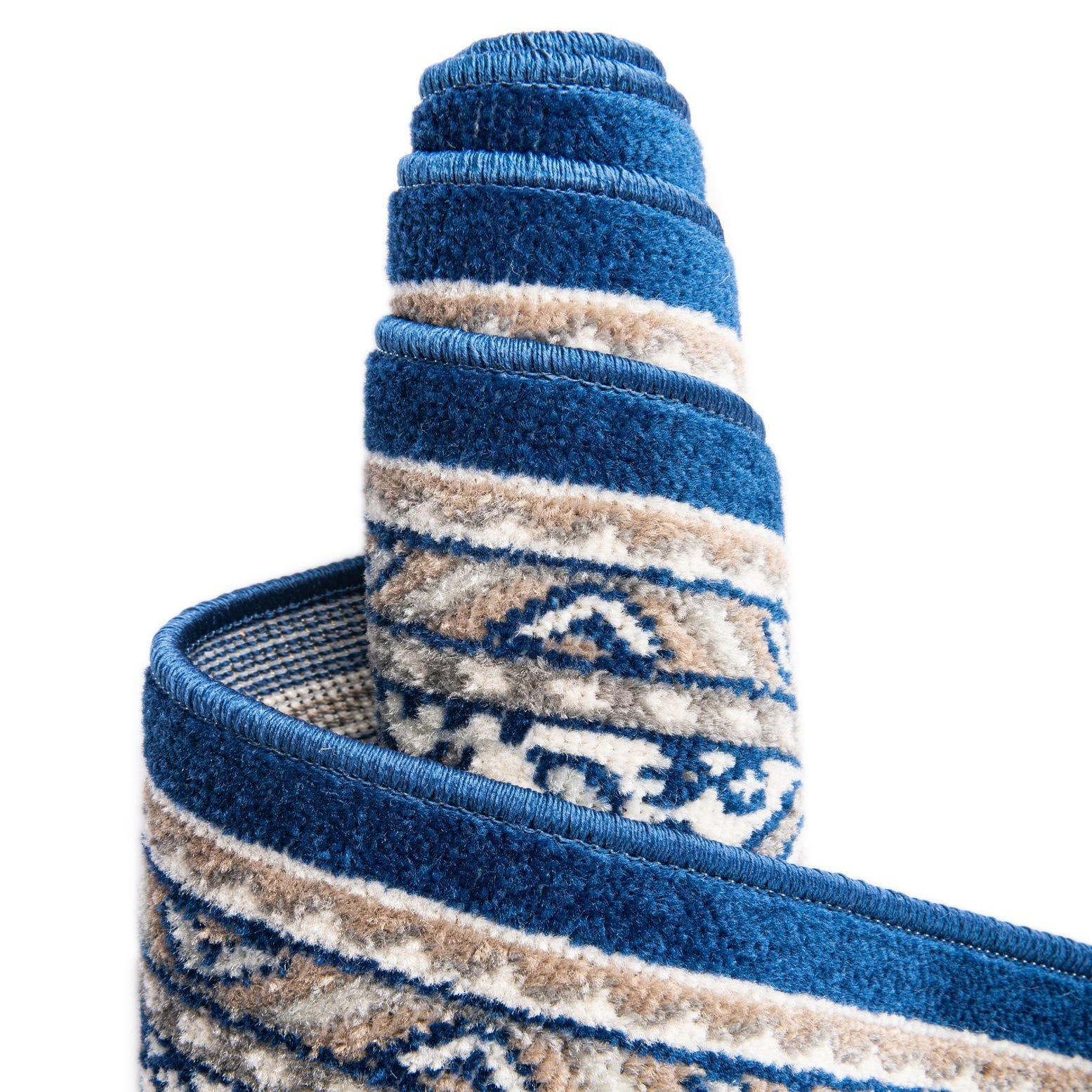 Place this rug beneath a round dining table to neatly anchor place settings, use it to define a bedroom seating nook, or set it in an entry to welcome guests with color and pattern. The blue ground and neutral accents pair cleanly with lightwood finishes, navy or gray upholstery, and brass or aged-metal hardware. It works well in transitional, coastal, and classic interiors, and layers easily over hardwood or tile to add pattern without overwhelming the space.