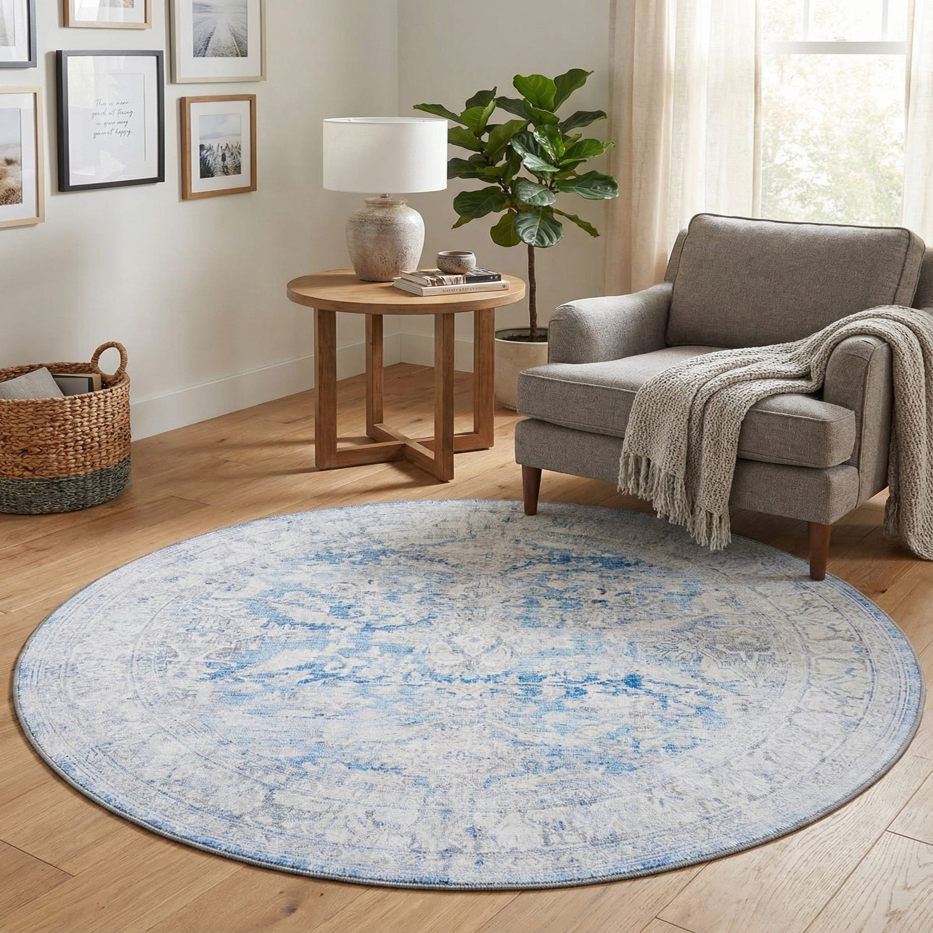 A 5' round blue and white distressed traditional rug with a subtle medallion pattern, suitable for various indoor spaces.